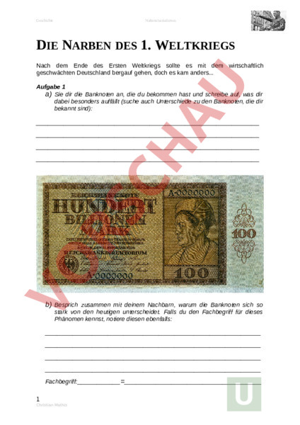 Geschichte Nationalsozialismus DIE NARBEN DES 1. WELTKRIEGS Nach dem Ende des Ersten Weltkriegs sollte es mit dem wirtschaftlich geschwächten Deutschland bergauf gehen, doch es kam anders. Aufgabe 1 a) Sie dir die Banknoten an, die du bekommen hast und schreibe auf, was dir dabei besonders auffällt (suche auch Unterschiede zu den Banknoten, die dir bekannt sind): b) Besprich zusammen mit deinem Nachbarn, warum die Banknoten sich so stark von den heutigen unterscheidet. Falls du den Fachbegriff für dieses Phänomen kennst, notiere diesen ebenfalls: Fachbegriff: 1 Christian Mathis Geschichte Nationalsozialismus In Deutschland kam es also im Jahr 1923 zu einer starken Inflation, weil die Regierung immer Mehr Geld druckte. Schau dir das Beispiel mit den Schockobons und den Münzen an und fülle den Lückentext mit den Begriffen unten: Grafik 1 Die Menge der und die des sind im. Wenn das so bleibt, kostet ein Schokobon immer etwa. 2 Christian Mathis Geschichte Nationalsozialismus Grafik 2 Die Geldmenge wird , doch die Menge der bleibt ungefähr gleich. Somit entsteht ein zwischen Geld und Gütern. Es kommt zu einer . Das hat zur Folge, dass die Schokobons (Güter) werden. Das Geld hat somit Wert. Begriffe: teurer, Gleichgewicht, Güter, Ungleichgewicht, Güter, Inflation, weniger, Geldes, gleich viel, erhöht c) Deutschland hatte nach dem Krieg fast kein Geld mehr. Was würdest du machen, wenn dir das Geld ausgeht und die Wirtschaft keine Arbeitsplätze bietet, um Geld zu verdienen? Nenne zwei Strategien: 1. 2. Str. Deutschlands: In den 1920er-Jahren setzte also nicht der erhoffte Aufschwung ein. Die Wirtschaftskrise in den USA (1929) hatte auch schlimme Folgen für Deutschland, denn die Amerikaner forderten ihr Geld zurück, dass sie in den letzten Jahren an Deutschland ausgeliehen hatten. Aufgabe 2 Lest die drei Texte im Geschichtsbuch auf S. 88 und beantwortet anschliessend folgende Fragen (in 3er-Gruppen): a) Wer war in der Weimarer Republik (so hiess Deutschland nach dem 1. Weltkrieg) auf staatliche Unterstützung angewiesen? Nenne zwei Gruppen von Menschen: 3 Christian Mathis Geschichte Nationalsozialismus b) Warum nützte die Arbeitslosenversicherung, die 1927 in Deutschland gegründet wurde, den meisten Arbeitslosen nicht viel? Nenne zwei Gründe: c) Warum verloren viele Menschen in Deutschland das Vertrauen in die demokratischen Parteien? Aufgabe 3 Besprecht zu dritt, wie es dem Mann auf dem Bild unten geht und warum dieser am Boden sitzt. Schreibt eure Erkenntnisse stichwortartig auf: Wie war die Stimmung unter den Menschen zu dieser Zeit? fröhlich elend positiv aussichtslos ängstlich heiter Aufgabe 4 4 Christian Mathis Geschichte Nationalsozialismus Schau dir den Filmausschnitt zu Adolf Hitler an und beantworte dazu folgende Fragen: a) Was sagte Adolf Hitler über seine Zeit an der Front während dem 1. Weltkrieg? b) Durch was fiel Hitler in der Schule auf? c) Wo fand Adolf Hitler nach langer Zeit ohne Arbeit endlich wieder ein Ziel? Abbildung 1: Hitler während dem 1. Weltkrieg (in Soldatenuniform) d) In welchem Bereich machte Hitler nach dem 1. Weltkrieg Karriere? e) Wem schrieb Hitler die Schuld an der Niederlage Deutschlands zu? 5 Christian Mathis Geschichte Nationalsozialismus Abbildung 2: Hitler als wichtiger Politiker im Jahr 1933 Rassismus: Antisemitismus: DAS ENDE DER WEIMARER REPUBLIK Die Weimarer Republik entstand nach dem Ende des Zweiten Weltkriegs. Das Staatssystem wechselte also von einer Monarchie (Kaiser hatte das Sagen) zu einer Republik. Repetition a) Wer hatte statt dem Kaiser nun das Sagen in der Weimarer Republik? 6 Christian Mathis Geschichte Nationalsozialismus b) Lies den Text Q2 (Buch S. 79) durch und versuche, die folgenden Begriffe zu in Spalte 2 zu erklären und schreibe in der 3. Spalte auf, mit welchem politischen Amt der Schweiz der Begriff zu vergleichen ist. BEGRIFF AUS DEM ERKLÄRUNG TEXT Q2 der Weimarer Verfassung von 1919 GEinband LEICHWERTIGES AMT IN DER HEUTIGEN SCHWEIZ Reichskanzler Reichsminister Reichspräsident Reichstag Abgeordnete Bewaffnete Macht Adolf Hitler wurde 1921 Parteivorsitzender der rechtsradikalen Nationalsozialistischen Deutschen Arbeiterpartei (NSDAP), die der grosse Gegenspieler der Kommunistischen Partei Deutschlands (KPD) war. In ihrem Parteiprogram stand der radikale Antisemitismus und die Ablehnung der Demokratie. Dies wurde als Gefahr für die Weimarer Republik wahrgenommen, weshalb die NSDAP ab 1923 sogar an gewissen Orten vorübergehend verboten wurde. Aufgabe 1 a) Fülle die Tabelle unten aus: NATIONALSOZIALISTISCHE DEUTSCHE ARBEITERPARTEI (NSDAP) Vorsitzender (Parteichef) 7 Christian Mathis Geschichte Nationalsozialismus Wichtigste Gegenpartei 2 Punkte im Parteiprogram Grund für vorübergehendes Verbot Lies die Texte «Reichskanzler Hiter» und «Der Reichstagsbrand und seine Folgen» im Buch S. 92 durch und beantworte folgende Fragen: b) Warum wollte Hitler 1933 Neuwahlen? c) Welche Folge hat eine Notverordnung? d) Erreichte Hitler sein Wahlziel? Aufgabe 2 Schau dir den Film «Die Machtergreifung» an und beantworte folgende Fragen: a) Was war der erste Schritt in Richtung Diktatur? b) Warum geht die SA noch während dem Reichstagsbrand auf «Kommunistenjad»? 8 Christian Mathis Geschichte Nationalsozialismus c) Warum erlebt die NSDAP vor Gericht eine peinliche Niederlage? d) Wie lautet eine zweite Version der Erklärung zur Reichstagsbrandes? Aufgabe 3 Lest nun zu zweit den Text «Festigung der Diktatur» und die Quelle Q2 durch. a) Haben die Nationalsozialisten ihre Interessen wirklich deomokratisch durchsetzen können? Begründet eure Antwort: GLOSSAR: Nationalsozialisten (Partei: NSDAP), auch Nazis, auch NS Kommunisten (Partei: KPD), auch Sozialisten, auch Bolschewisten Sozialdemokraten (Partei: SPD) Aufgabe 4 9 Christian Mathis Geschichte Nationalsozialismus a) Vor diesem Plakat treffen sich je einen Wähler der KPD und der NSDAP. Sie starren auf den Text und diskutieren miteinander darüber (R: KPD, L