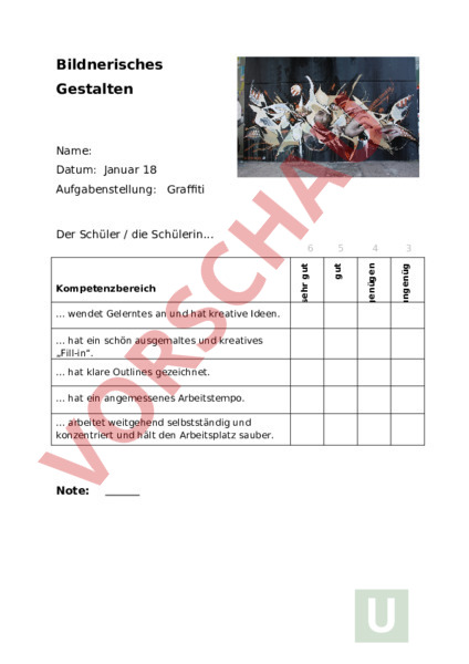 Bildnerisches Gestalten Name: Datum: Januar 18 Aufgabenstellung: Graffiti . wendet Gelerntes an und hat kreative Ideen. . hat ein schön ausgemaltes und kreatives „Fill-in. . hat klare Outlines gezeichnet. . hat ein angemessenes Arbeitstempo. . arbeitet weitgehend selbstständig und konzentriert und hält den Arbeitsplatz sauber. Note: 5 4 3 genügen ungenüg Kompetenzbereich sehr gut 6 gut Der Schüler die Schülerin.