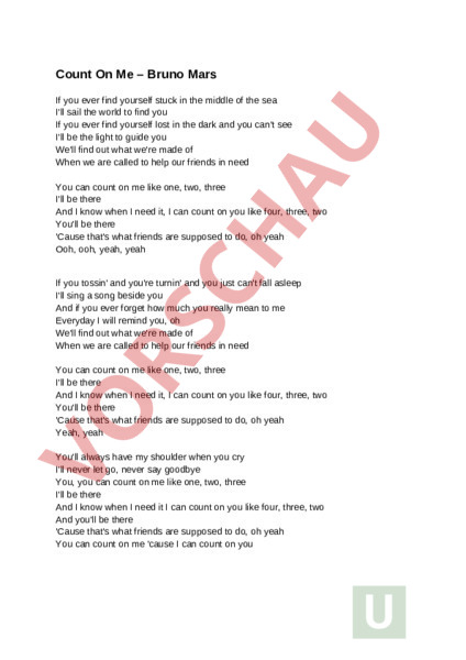 Count On Me – Bruno Mars If you ever find yourself stuck in the middle of the sea Ill sail the world to find you If you ever find yourself lost in the dark and you cant see Ill be the light to guide you Well find out what were made of When we are called to help our friends in need You can count on me like one, two, three Ill be there And know when need it, can count on you like four, three, two Youll be there Cause that what friends are supposed to do, oh yeah Ooh, ooh, yeah, yeah If you tossin and youre turnin and you just cant fall asleep Ill sing song beside you And if you ever forget how much you really mean to me Everyday will remind you, oh Well find out what were made of When we are called to help our friends in need You can count on me like one, two, three Ill be there And know when need it, can count on you like four, three, two Youll be there Cause that what friends are supposed to do, oh yeah Yeah, yeah Youll always have my shoulder when you cry Ill never let go, never say goodbye You, you can count on me like one, two, three Ill be there And know when need it can count on you like four, three, two And youll be there Cause that what friends are supposed to do, oh yeah You can count on me cause can count on you