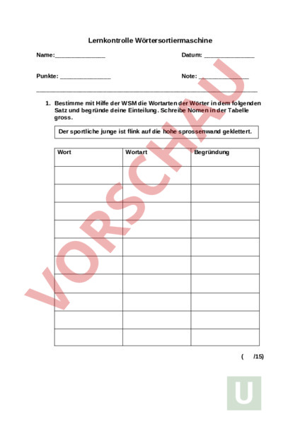 Lernkontrolle Wörtersortiermaschine Name:_ Datum: Punkte: Note: 1. Bestimme mit Hilfe der WSM die Wortarten der Wörter in dem folgenden Satz und begründe deine Einteilung. Schreibe Nomen in der Tabelle gross. Der sportliche junge ist flink auf die hohe sprossenwand geklettert. Wort Wortart Begründung /15) 2. Bestimme mit Hilfe der WSM die Wortarten der Wörter in dem folgenden Satz. Benutze dafür die folgenden Abkürzungen: Nomen N, Verb V, Adjektiv A, Pronomen Pro, Partikel P Überschreibe kleine Anfangsbuchstaben bei Nomen mit einem Grossbuchstaben! Mit einem schrillen pfiff hat der strenge schiedsrichter erreicht, dass die streithähne wieder vernünftig und friedlich weiterspielen. /17)