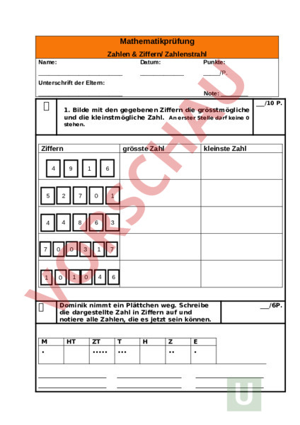 Arbeitsblatt: Mathetest Zahlen Ziffern/Zahlenstrahl