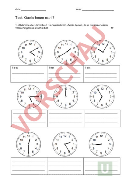 date:_ nom: Test: Quelle heure est-il? 1.) Schreibe die Uhrzeit auf Französisch hin. Achte darauf, dass du immer einen vollständigen Satz schreibst. 9/ Il est Il est Il est date:_ nom: 2.) Zeichne die genaue Uhrzeit ein. Il est deux heures moins vingt-cinq. Il est vingt heures et demie. 9/ Il est seize heures. Il est une heure dix. Il est quatorze heures moins vingt-deux. Il est dix heures moins le quart. Il est onze heures et quart. Il est midi. Il est dix-sept heures dixsept. date:_ nom: 3.) Übersetze auf Französisch, indem du die Uhrzeit ausschreibst. Bsp.: Es ist 17.00 Il est dix-sept heures. 5/ Es ist 16.35 Uhr. Es ist 12.05 Uhr. Es ist 3.00 Uhr. Es ist 22.40 Uhr. Es ist 8.16 Uhr. Bonus 1/ Es ist 14.45 Uhr nachmittags. Bonne Chance max. Punkte: 23 1 erreichte Punkte: Note: