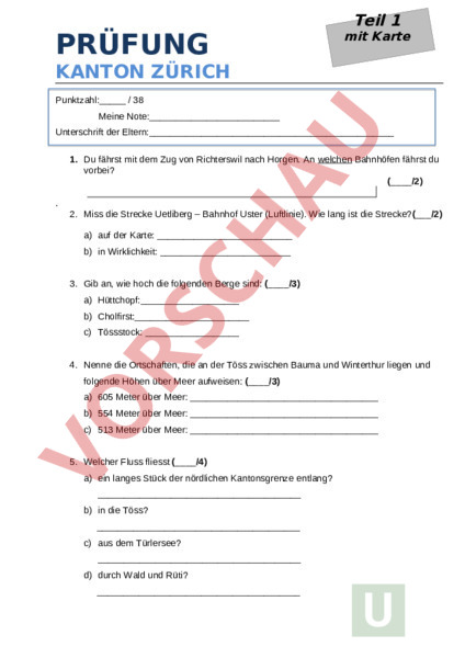 PRÜFUNG Teil 1 mit Karte KANTON ZÜRICH Punktzahl:_ 38 Meine Note:_ Unterschrift der Eltern:_ 1. Du fährst mit dem Zug von Richterswil nach Horgen. An welchen Bahnhöfen fährst du vorbei? (/2) 2. Miss die Strecke Uetliberg – Bahnhof Uster (Luftlinie). Wie lang ist die Strecke?(_/2) a) auf der Karte: b) in Wirklichkeit: 3. Gib an, wie hoch die folgenden Berge sind: (/3) a) Hüttchopf:_ b) Cholfirst: c) Tössstock: 4. Nenne die Ortschaften, die an der Töss zwischen Bauma und Winterthur liegen und folgende Höhen über Meer aufweisen: (/3) a) 605 Meter über Meer: b) 554 Meter über Meer: c) 513 Meter über Meer: 5. Welcher Fluss fliesst (/4) a) ein langes Stück der nördlichen Kantonsgrenze entlang? b) in die Töss? c) aus dem Türlersee? d) durch Wald und Rüti? Teil 2 PRÜFUNG ohne Karte KANTON ZÜRICH 1. Male das Wappen des Kantons Zürichs in die Vorlage rechts. (_/1) 2. Zähle alle Kantone auf, an die der Kanton Zürich grenzen: (_ /3) 3. Es grenzt auch ein Land an den Kanton Zürich. (_/1) a) Wie heisst das Land? b) In welcher Himmelsrichtung grenzt das Land an den Kanton Zürich? 4. Zeichne in die Karte folgende Dinge möglichst genau ein und schreibe den Buchstaben dazu: a) b) c) d) e) f) g) h) i) j) k) Rafzerfeld (Beispiel) Stadt Winterthur Stadt Bülach Stadt Zürich Ortschaft Rafz Zürcher Unterland Züricher Oberland Zürcher Weinland Zürichseegebiet Limmattal Knonaueramt Säuliamt a) (_/5) 5. a) Beschrifte die Bezirke. b) Schreibe die Namen der nummerierten Gewässer in die Tabelle. (_/10) 9 8 6 D 4 7 5 1 0 3 1 1 2 2 1 1 7 2 8 3 9 4 10 5 11 6 12 6. Notiere die passenden Nummern zu den gesuchten Bergen in der Tabelle (/4) Pfannenstiel Zürichberg Schnebelhorn Uetliberg Lägern Irchel Schauenberg Hörnli