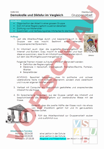 NMM GG Staatskunde Demokratie und Diktatur im Vergleich Gruppenarbeit Arbeitsziel: • Organisation der Arbeit in einer grossen Gruppe • Sich mit einer Regierungsform auseinandersetzen • Sichtung von Materialien • Zusammen- und Verfassung eines Infotextes für die Klasse Auftrag: 1. Lest alle Arbeitsaufträge durch und besprecht euch in der Gruppe wer was macht. Bestimmt einen leitenden Gruppensprecher/Sprecherin. 2. Ihr informiert euch über die zugeteilte Regierungsform im Internet und Büchern. Dazu macht ihr euch Notizen und fasst diese so zusammen, dass ihr ein Infoblatt zusammenstellen könnt, auf dem das Wichtigste zusammengefasst ist. Diktatur Folgende Themen müssen auf eurem Infoblatt behandelt werden: Definition der Regierungsform Merkmale Herrschaft, Staatsgewalt, Freiheiten/Rechte, Parteien, Wahlen Beispielländer ACHTUNG: Beachtet besonders, dass ihr politische und schwer verständliche Texte nicht einfach übernehmt, sondern stark vereinfacht und in euren eigenen Worten erklärt. 3. Verfasst mit Computer ein übersichtlich gestaltetes und ansprechendes Infoblatt für die Klasse. 4. Ein Sprecher/eine Sprecherin aus der Gruppe verteilt das Infoblatt und bespricht/erklärt die Regierungsform auf verständliche Weise mit der Klasse. Bedenkt, dass die zweite Hälfte der Klasse noch nie etwas von eurer Staatsform gehört hat und ihr genauestens erklären solltet. 5. Füllt das Arbeitsprotokoll zur Gruppenarbeit sauber und ausführlich aus. Arbeitszeiten/Termine Montag, 28.04.08 Montag, 05.05.08 Mittwoch, 07.05.08 eine Lektion in der Schule eine Lektion in der Schule Abgabe und Präsentation der Arbeit in der Klasse NMM GG Staatskunde Demokratie und Diktatur im Vergleich Auswertung der Gruppenarbeit Gruppenmitglieder: Gruppensprecher/in Präsentator/in Verfasser des Infotextes Materialsammler/in Notizenschreiber/in Auswertungsschreiber/in Spezialposten?? Wie schnell konnte nach dem Erteilen des Auftrags gearbeitet werden? Wie verlief die Verteilung der einzelnen Arbeitsposten? Beschreibt die Gruppendynamik bei euch in der Grossgruppe. Wie gut verlief die Arbeit mit 8 Gruppenmitgliedern? Vorteile/Nachteile im Vergleich mit einer Kleingruppe (max. 4 Leute) Wie zufrieden seid ihr mit eurem Gruppenergebnis? Danke für das ausführliche und ehrliche Ausfüllen der Auswertung!