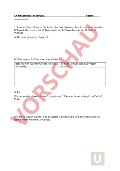 LK Unterwegs in Europa Name: 1. Projekt «Das Hilfswerk für Kinder der Landstrasse». Beschreibe in a), was das Hilfswerk tat. Nenne bei b) Argumente der Befürworter und der Kritiker (3 Punkte). a) Um was ging es im Projekt? b) Was sagten Befürworter, was Kritiker? Befürworter (warum war das Projekt sinnvoll?): Kritiker (warum war das Projekt schlecht?): 2. EU Warum wurde eigentlich die EU gegründet? Was war das ursprüngliche Ziel? (1 Punkt) Erkläre in kurzen Sätzen, was bilaterale Verträge sind und zwischen wem sie geschlossen wurden! (2 Punkte) 3. Wirtschaftssektoren Hier sind einige Berufe aufgelistet. Schreibe diese in die richtige Spalte der Sektoren! (3 Punkte) Fischer, Arzt, Fabrikarbeiter, Verkäufer, Viehzüchter, Schreiner 1. Sektor 2. Sektor 3. Sektor 4. Tourismus Luzern ist zu einem beliebten Ausflugsziel bei ausländischen Touristen geworden. Nenne Vor- und Nachteile, die der Tourismus in Luzern mit sich bringt! (3 Punkte) Vorteile Nachteile 5. Verkehr Stadt – Land (3 Punkte) Kreuze alle RICHTIGEN Aussagen an! Fast die Hälfte aller zurückgelegten Distanzen werden in der CH im Auto zurückgelegt Der Gotthard-Basistunnel ist der längste Eisenbahntunnel der Welt Es fahren mehr Personenzüge als Güterzüge durch den Gotthard-Basistunnel Das Ziel, mehr Verkehr von der Strasse auf die Schiene zu verlagern, wurde aufgegeben Statistisch gesehen wird eine Gemeinde mit mindestens 10 00 Einwohnern als Stadt bezeichnet Zürich gilt als Global City, Lagos aber nicht, obwohl Lagos viel mehr Einwohner besitzt Total 15 Punkte