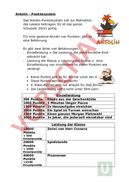 Antolin – Punktesystem Das Antolin-Punktesystem soll zur Motivation des Lesens beitragen. Es ist das ganze Schuljahr 20/21 gültig. Für eine gewisse Anzahl von Punkten, gibt es eine Belohnung. Es gibt zwei Arten von Belohnungen: Einzelleistung Die Leistung, die jedes einzelne Kind erbracht hat. Leistung der Klasse Leistung der Klasse eine Einzelleistung von mindestens so vielen Punkten wie verlangt. Keine Punkte gibt es für Bücher unter der 4. Klasse! Diese Punkte werden gelöscht! 4. Klass-Bücher sind nur erlaubt für DaZ-Kinder! Die Leseleistung sollte nicht unter 50% sein! 500 Punkte 1000 Punkte 1500 Punkte 2000 Punkte 2500 Punkte 3000 Punkte 10000 Punkte Einzelleistung Etwas aus der Geschenktüte 5 Minuten länger Pause 1x Hausaufgabe streichen Ein Spiel im Turnen wünschen Einen ganzen Morgen Platzwahl 3x Joker, die jederzeit einsetzbar sind Leistung der Klasse Znüni von Herr Crosara 500 Einzelpunkte 20000 Punkte Spielstunde 1000 Einzelpunkte 40000 Punkte 1500 Einzelpunkte Pizzaessen 60000 Punkte 2000 Einzelpunkte Skillspark