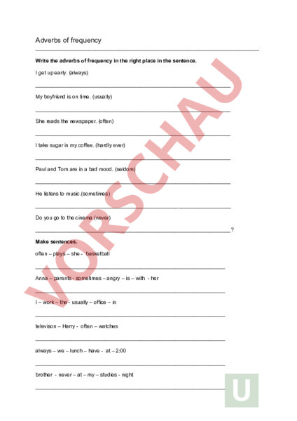Adverbs of frequency Write the adverbs of frequency in the right place in the sentence. get up early. (always) My boyfriend is on time. (usually) She reads the newspaper. (often) take sugar in my coffee. (hardly ever) Paul and Tom are in bad mood. (seldom) He listens to music.(sometimes) Do you go to the cinema.(never)? Make sentences. often – plays – she basketball Anna – parents sometimes – angry – is – with her – work – the usually – office – in televison – Harry often – watches always – we – lunch – have at – 2:00 brother never – at – my – studies night