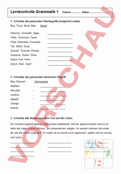 Lernkontrolle Grammatik 1 Datum: Name: . 1. Schreibe die passenden Oberbegriffe (möglichst exakt) Bsp: Tisch, Stuhl, Bett Möbel Hammer, Schaufel, Säge Teller, Schüssel, Tasse Flöte, Klarinette, Trompete Tee, Milch, Sirup Gewehr, Schwert, Pistole Susanne, Noemi, Silvia Katze, Kuh, Huhn Zürich, Bern, Genf 2. Schreibe den passenden deutschen Begriff Bsp: Dessert Nachspeise Applaus Resultat Lexikon Appetit Orange Inserat 3. Schreibe alle Nomen aus dem Text auf die Linien. Ein hochdruckgebiet gelangt über unsere landesteile. Auf der alpennordseite wird es im laufe des tages immer schöner, die temperaturen steigen. Im westen nehmen die winde ab und die sonne zeigt sich. Im süden ist es zuerst noch regnerisch, später wird es sonnig und warm. 4. Bilde aus dem Nomen ein Adjektiv Freude Punkt Ruhe Friede Lust Schreck Glück Macht 5. Bilde die Mehrzahlformen Spiel Freundin Hemd Koffer Thema Geschäft Ereignis Heft