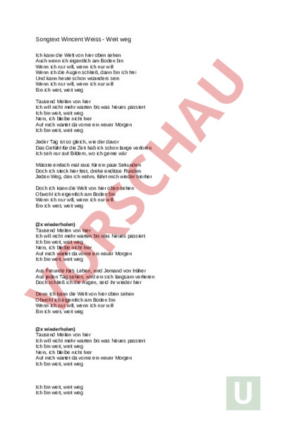 Songtext Wincent Weiss Weit weg Ich kann die Welt von hier oben sehen Auch wenn ich eigentlich am Boden bin Wenn ich nur will, wenn ich nur will Wenn ich die Augen schließ, dann bin ich frei Und kann heute schon woanders sein Wenn ich nur will, wenn ich nur will Bin ich weit, weit weg Tausend Meilen von hier Ich will nicht mehr warten bis was Neues passiert Ich bin weit, weit weg Nein, ich bleibe nicht hier Auf mich wartet da vorn ein neuer Morgn Ich bin weit, weit weg Jeder Tag ist so gleich, wie der davor Das Gefühl für die Zeit hab ich schon lange verloren Ich seh nur auf Bildern, wo ich gerne wär Müsste einfach mal raus für ein paar Sekunden Doch ich steck hier fest, drehe endlose Runden Jeden Weg, den ich nehm, führt mich wieder hierher Doch ich kann die Welt von hier oben sehen Obwohl ich eigentlich am Boden bin Wenn ich nur will, wenn ich nur will Bin ich weit, weit weg (2x wiederholen) Tausend Meilen von hier Ich will nicht mehr warten bis was Neues passiert Ich bin weit, weit weg Nein, ich bleibe nicht hier Auf mich wartet da vorne ein neuer Morgen Ich bin weit, weit weg Aus Freunde für Leben, wird Jemand von früher Aus jeden Tag sehen, wird ein sich langsam verlieren Doch schließ ich die Augen, seid ihr wieder hier Denn ich kann die Welt von hier oben sehen Obwohl ich eigentlich am Boden bin Wenn ich nur will, wenn ich nur will Bin ich weit, weit weg (2x wiederholen) Tausend Meilen von hier Ich will nicht mehr warten bis was Neues passiert Ich bin weit, weit weg Nein, ich bleibe nicht hier Auf mich wartet da vorne ein neuer Morgen Ich bin weit, weit weg Ich bin weit, weit weg Ich bin weit, weit weg