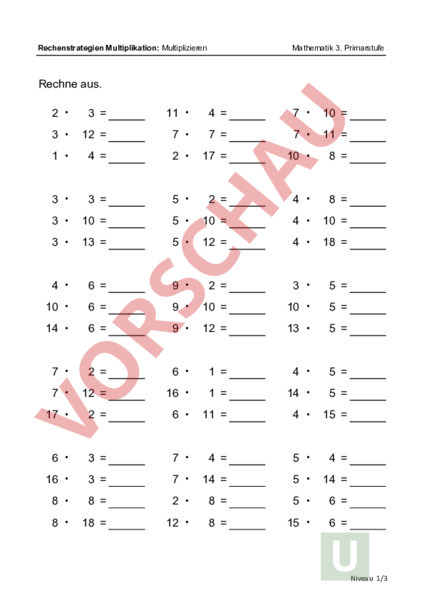 Mathematik 3. Primarstufe Rechenstrategien Multiplikation: Multiplizieren Rechne aus. · 3 · 1 · 2 · 3 · 3 · 3 · 10 · 14 · 4 · 7 · 17 · 7 · 16 · 8 · 8 · 6 3 12 4 3 10 13 6 6 6 2 12 2 3 3 8 18 · 7 · 2 · 11 · 5 · 5 · 5 · 9 · 9 · 9 · 16 · 6 · 6 · 7 · 2 · 12 · 7 17 · 7 · 10 · 2 4 4 7 10 12 2 10 12 1 1 11 4 14 8 8 7 · 4 · 4 · · 10 · 13 · 3 · 14 · 4 · 4 · 5 · 5 · 15 · 5 10 11 8 8 10 18 5 5 5 5 5 15 4 14 6 6 Niveau 1/3