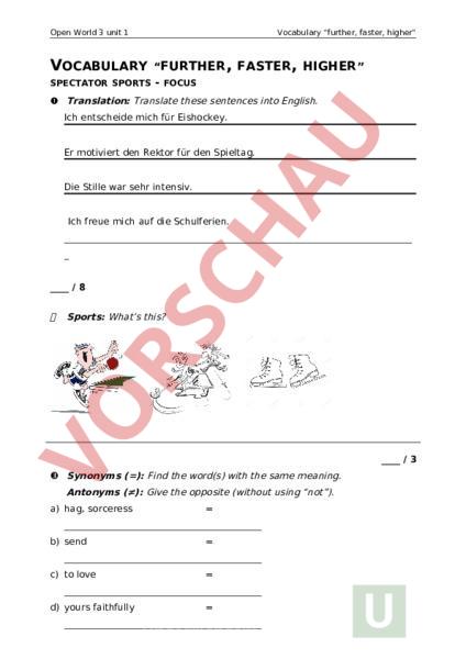 Open World 3 unit 1 Vocabulary further, faster, higher VOCABULARY SPECTATOR FURTHER, FASTER, HIGHER SPORTS FOCUS Translation: Translate these sentences into English. Ich entscheide mich für Eishockey. Er motiviert den Rektor für den Spieltag. Die Stille war sehr intensiv. Ich freue mich auf die Schulferien. 8 Sports: Whats this? 3 Synonyms (): Find the word(s) with the same meaning. Antonyms (): Give the opposite (without using not). a) hag, sorceress b) send c) to love d) yours faithfully Open World 3 unit 1 Vocabulary further, faster, higher e) war 5 Total: 17 VOCABULARY SPECTATOR SPORT Translation: Translate these sentences into English. Ich entscheide mich für Eishockey. go for ice hockey. Er motiviert den Rektor für den Spieltag. He motivates the head teacher for the match day. Die Stille war sehr intensiv. The silence was intense. Ich freue mich auf die Schulferien. am looking forward to the school holiday. Sports: Whats this? table tennis floorball skating Synonyms (): Find the word(s) with the same meaning. Antonyms (): Give the opposite (without using not). f) hag, sorceresswitch_ g) send submit_ h) to loveto adore i) yours faithfully yours sincerely Open World 3 unit 1 j) war Vocabulary further, faster, higher peace_ Total: 17