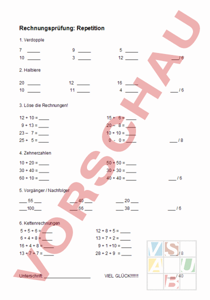 Rechnungsprüfung: Repetition 1. Verdopple 7 9 5 10 3 12 20 12 16 10 11 4 / 6 2. Halbiere 6 3. Löse die Rechnungen! 12 10 15 6 9 13 20 – 8 23 – 7 10 10 25 5 0 0 8 4. Zehnerzahlen 10 20 50 50 30 40 30 30 60 10 40 40 6 5. Vorgänger Nachfolger 55 40 20 100 66 38 6 6. Kettenrechnungen 5 5 6 12 8 5 6 4 8 13 7 2 16 4 8 9 1 10 13 7 7 28 2 9 Unterschrift: VIEL GLÜCK!!!!!!! 8 40
