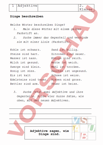 1 Adjektive 2. Klasse Dinge beschreiben Welche Wörter beschreiben Dinge? 1. Male diese Wörter mit einem gelben Farbstift an. 2. Suche immer das Gegenteil und verbinde sie mit einer Linie (Farbstift). Kohle ist schwarz. Sand ist billig. Steine sind hart. Zitronen sind sauer. Wasser ist nass. Könige sind reich. Milch ist gesund. Watte ist weich. Zwerge sind klein. Mehl ist trocken. Honig ist süss. Rauchen ist ungesund. Eis ist kalt Schnee ist weiss. Edelsteine sind teuer. Riesen sind gross. Bettler sind arm. Feuer ist heiss. 3. Suche jetzt zwei Adjektive und ihre Gegenteile. Bilde vier kurze Sätze, wie oben, mit den neuen Adjektiven. Adjektive sagen, wie Dinge sind. 2 Adjektive 2. Klasse Adjektive schreibt man klein Du kennst viele Adjektive. 1. Schreibe den passenden Anfangsbuchstaben klein. und rauri eer ustig chnel ang alt üde eit ut elb arm chön euer 2. Suche aus diesen sechzehn Adjektive vier aus und erfinde vier Sätze, die Gegenstände beschreiben. Bespiel: Mein Ball ist rund. Adjektive schreibt man 3 Adjektive 2. Klasse immer klein, ausser am Anfang eines Satzes. Suche die Adjektive 1. Male die Adjektive mit einem gelben Farbstift an. hohe Berge ein kalter Wind schöne Ferien ein grosser Baum heisser Tee eine rote Rose fleissige Kinder eine weiche Banane sonniges Wetter ein freier Tag nasse Schuhe ein warmes Bad lustige Witze ein langweiliger Film hohe Häuser ein spannendes Rennen laute Musik ein wackliger Stuhl 2. Male alle Adjektive mit einem gelben Farbstift an. Gestern fand ich eine grosse, rote, viereckige Tasche. Heute ist sonniges und warmes Sommerwetter. Ich habe neue, gestreifte Hosen. Mein Nachbar hat einen kleinen, weissen Hund. Das ist ein helles, grosses Zimmer. Sie hat kurze und schwarze Haare. Der runde Tisch ist weiss. Sandras neue Schuhe sind weiss. 4 Adjektive 2. Klasse Der nette, alte Nachbar ist zufrieden. Das ist eine schöne, farbige Karte mit lustigen Bildern. Schau dort, ein grosser, grüner Frosch auf dem runden Seerosenblatt. Adjektiv, Verb oder Nomen Du kennst bereits zwei andere Wortarten; die Nomen und die Verben. 1. Male alle folgenden Adjektive gelb, Nomen braun und Verben blau an. Aut Fisch lus tig Hau flieg en Katze gehe Buch essen 2. hei ss al schwim men grün schne ll fahre Blume gut Male in den folgenden Sätzen nur die Adjektive gelb an. Heute ist schönes Wetter. Das ist ein langweiliges Buch. Daniela und Mario sind fleissige Schüler. 5 Adjektive 2. Klasse Zum Geburtstag wünsche ich mir ein neues Rollbrett. Der Schnee auf der Strasse ist schmutzig und nicht mehr sauber. Unser neues Auto ist grün. Die Lehrerin erzählt eine lustige Geschichte. Ich mag frisches Brot mit süsser Konfitüre. 6 Adjektive 2. Klasse Ich sehe etwas, das du nicht siehst Adjektive spielen eine grosse Rolle im Spiel „Ich sehe etwas, das du nicht siehst weil sie uns sagen, wie die Dinge aussehen. 1. Such dir einen oder zwei Mitspieler. 2. Setzt euch in die Leseecke. Jeder mit seiner Tafel und einem Bleistift. 3. Nun sucht sich jeder einen Gegenstand. Du musst ihn von deinem Platz aus sehen. Du darfst dich natürlich auch umdrehen. 4. Schreibe deinen Gegenstand auf die Tafel. 5. Beschreibe den anderen deinen Gegenstand mit vielen Adjektiven. (Zum Beispiel: „Ich sehe etwas, das du nicht siehst und das ist schwer.) 6. Immer wenn du deinen Gegenstand mit einem Adjektiv beschrieben hast, dürfen die anderen Kinder einmal raten. Wenn sie es noch nicht wissen, beschreibst du ihn nochmals. Diesmal mit einem anderen Adjektiv. Bis sie es herausfinden! 7. Nun ist das nächste Kind an der Reihe, Bis alle fünfmal einen Gegenstand beschreiben durften. 8. Viel Spass! Ich sehe etwas, das du nicht siehst und 7 Adjektive 2. Klasse 8 Adjektive 2. Klasse Verschiedene Formen Auch Formen sind Adjektive. 1. Schreibe das Adjektiv auf, das zur Zeichnung passt. rund, dreieckig, viereckig, oval, rund, gerade Der Ball ist rund. Dieser Zauberstab ist. Die Erde ist. Dieses Bild ist. Das Ei ist . Das Zelt ist . 2. Male Gegenstände, die zu den Formen passen. Nimm nicht die Gegenstände von oben! 9 Adjektive 2. Klasse lang, bewegl ich rund, flach dreiec kig halbru nd, farbig Schöne Ferien! Wann sind Ferien schön? 1. Schreibe zu jedem Nomen ein passendes Adjektiv. Das Adjektiv „schön ist verboten. herrliches Wetter Himmel Spiele Wasser Tage Leute Kinder Aussicht Essen 10 Adjektive 2. Klasse Spielplatz Ausflüge Buch Markt Strand Hotel 2. Beschreibe dein liebstes Ferienerlebnis aus den Sommerferien (höchstens sechs Sätze). 11 Adjektive 2. Klasse Zum Glück ist die Welt nicht nur schwarz und weiss Farbenwörter sind auch Adjektive 1. Schreibe die passende Farbe in die Lücke. Die Erdbeere ist die Erdbeere Der Esel ist der Esel Der Himmel ist der Himmel Das Gras ist das Gras Der Schnee ist der Schnee Der Kaffee ist der Kaffee Die Zitrone ist die Zitrone Der Kaminfeger ist der Kaminfeger 2. Suche die versteckten Farben in dem Buchstabenchaos. 12 Adjektive 2. Klasse Die Wörter stehen waagerecht (von links nach rechts) oder senkrecht (von oben nach unten) in dem Kasten. Es sind zehn Farbenwörter im Gitter versteckt. Male die Adjektive an, wenn du sie findest. Jedes W W R U Z A A H F S Ü N O K F R I U R H T P R A W B A E U A E L R H R W I S I Z I Z E B P V O E T Ö 13 Adjektive 2. Klasse So können Menschen sein 1. Schreibe die Adjektive zum passenden Gesicht. glücklich, lustig, böse, grob, beleidigt, zufrieden, nett, traurig, zornig, fröhlich, interessant, frech, freundlich, unglücklich, ehrlich, langweilig glücklich 2. böse Beschreibe und zeichne deine Haare und deine Frisur. Wähle die zutreffenden Adjektive aus. So sieht meine Frisur frisch geschnitten gekämmt zerzaust gelockt glatt gewellt gekraust kurz halblang lang gewaschen ungewaschen hellbraun braun blond dunkelbraun rot hellblond dunkelblond schwarz 14 Adjektive 2. Klasse Schmeckt oder schmeckts nicht? Was würdest du essen und trinken? Und was nicht? 1. Schreibe die Dinge in das passende Kästchen und unterstreiche di
