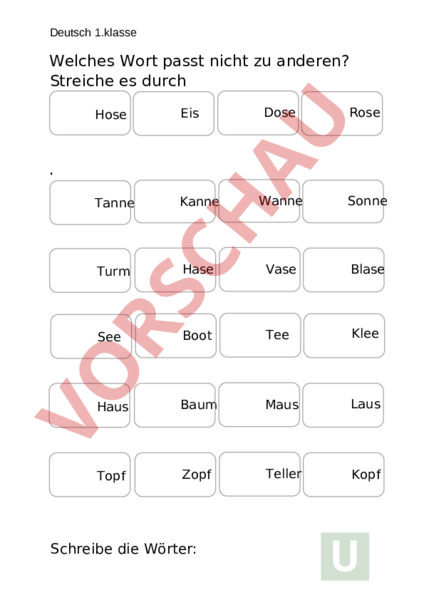 Deutsch 1.klasse Welches Wort passt nicht zu anderen? Streiche es durch Dose Rose Kanne Wanne Sonne Turm Hase Vase Blase See Boot Tee Klee Haus Baum Maus Laus Topf Zopf Teller Kopf Hose Eis Tanne Schreibe die Wörter: Deutsch 1.klasse Deutsch 1.klasse Schreibe die Wörter: