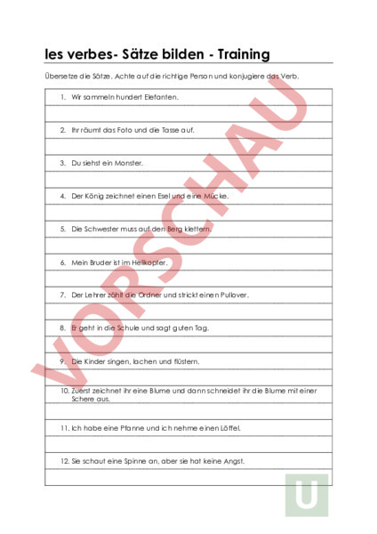 les verbes- Sätze bilden Training Übersetze die Sätze. Achte auf die richtige Person und konjugiere das Verb. 1. Wir sammeln hundert Elefanten. 2. Ihr räumt das Foto und die Tasse auf. 3. Du siehst ein Monster. 4. Der König zeichnet einen Esel und eine Mücke. 5. Die Schwester muss auf den Berg klettern. 6. Mein Bruder ist im Helikopter. 7. Der Lehrer zählt die Ordner und strickt einen Pullover. 8. Er geht in die Schule und sagt guten Tag. 9. Die Kinder singen, lachen und flüstern. 10. Zuerst zeichnet ihr eine Blume und dann schneidet ihr die Blume mit einer Schere aus. 11. Ich habe eine Pfanne und ich nehme einen Löffel. 12. Sie schaut eine Spinne an, aber sie hat keine Angst. Schreibe nun eigene Sätze auf Deutsch auf und übersetzte sie ins Französische. 1. 2. 3. 4. 5. 6. 7. 8. 9. 10. 11. 12. 13. les verbes- Sätze bilden Training Lösungen Übersetze die Sätze. Achte auf die richtige Person und konjugiere das Verb. 13. Wir sammeln hundert Elefanten. Nous collectionnons cent éléphants. 14. Ihr räumt das Foto und die Tasse auf. Vous rangez la photo et la tasse. 15. Du siehst ein Monster. Tu vois un monstre. 16. Der König zeichnet einen Esel und eine Mücke. Le roi dessine un âne et un moustique. 17. Die Schwester muss auf den Berg klettern. La sœur doit grimper sur la montagne. 18. Mein Bruder ist im Helikopter. Mon frère est dans lhélicoptère. 19. Der Lehrer zählt die Ordner und strickt einen Pullover. Le professeur compte les classeurs et tricote un pullover. 20. Er geht in die Schule und sagt guten Tag. Il va à lécole et dit bonjour. 21. Die Kinder singen, lachen und flüstern. Les enfants chantent, rigolent et chuchotent. 22. Zuerst zeichnet ihr eine Blume und dann schneidet ihr die Blume mit einer Schere aus. Dabord vous dessinez une fleur et après vous découpez la fleur avec une ciseaux. 23. Ich habe eine Pfanne und ich nehme einen Löffel. Jai une casserole et je prends une cuillère. 24. Sie schaut eine Spinne an, aber sie hat keine Angst. Elle va une araignée, mais elle na pas de peur.