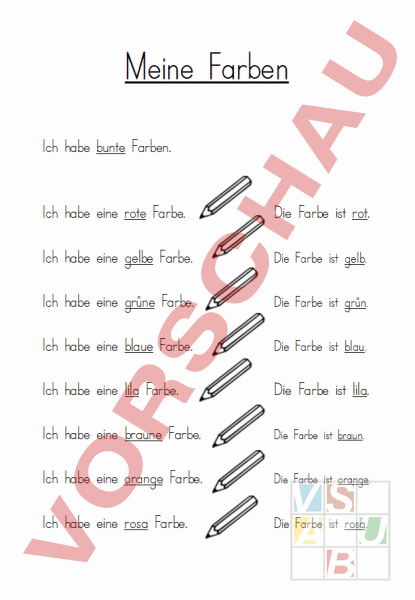 Meine Far en Ich ha unte Far en. Ich ha eine rote Far e. Die Far ist rot. Ich ha eine gel Far e. Die Far ist gel Ich ha eine grüne Far e. Die Far ist grün. Ich ha eine laue Far e. Die Far ist lau. Ich ha eine lila Far e. Die Far ist lila. Ich ha eine raune Far e. Die Far ist raun. Ich ha eine orange Far e. Die Far ist orange. Ich ha eine rosa Far e. Die Far ist rosa.