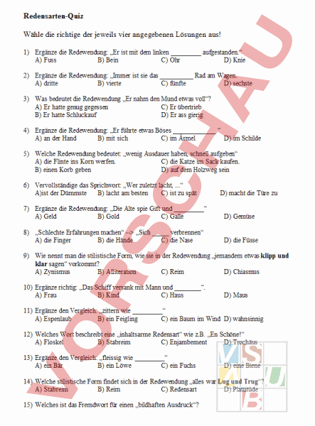 Redensarten mit Lücken und jeweils vier mögliche Lösungen, die in die Lücken passen könnten.