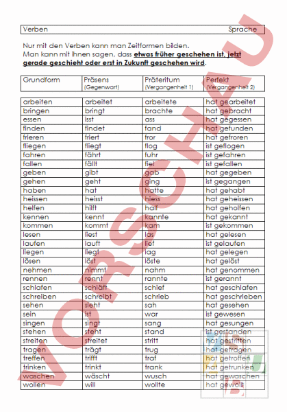 Verben Sprache Nur mit den Verben kann man Zeitformen bilden. Man kann mit ihnen sagen, dass etwas früher geschehen ist, jetzt gerade geschieht oder erst in Zukunft geschehen wird. Grundform Präsens Präteritum Perfekt arbeiten bringen essen finden frieren fliegen fahren fallen geben gehen haben heissen helfen kennen kommen lesen laufen liegen lösen nehmen rennen schlafen schreiben sehen sein singen stehen streiten tragen treffen trinken waschen wollen arbeitet bringt isst findet friert fliegt fährt fällt gibt geht hat heisst hilft kennt kommt liest lauft liegt löst nimmt rennt schläft schreibt sieht ist singt steht streitet trägt trifft trinkt wäscht will arbeitete brachte ass fand fror flog fuhr fiel gab ging hatte hiess half kannte kam las lief lag löste nahm rannte schief schrieb sah war sang stand stritt trug traf trank wusch wollte hat gearbeitet hat gebracht hat gegessen hat gefunden hat gefroren ist geflogen ist gefahren ist gefallen hat gegeben ist gegangen hat gehabt hat geheissen hat geholfen hat gekannt ist gekommen hat gelesen ist gelaufen hat gelegen hat gelöst hat genommen ist gerannt hat geschlafen hat geschrieben hat gesehen ist gewesen hat gesungen ist gestanden hat gestritten hat getragen hat getroffen hat getrunken hat gewaschen hat gewollt (Gegenwart) (Vergangenheit 1) (Vergangenheit 2)