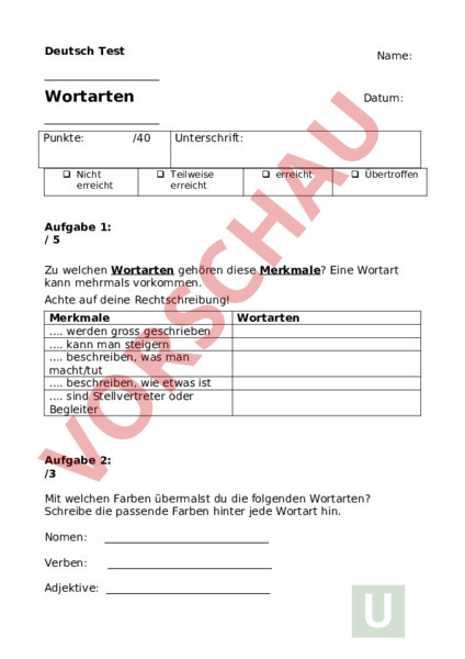 Deutsch Test Name: Wortarten Datum: Punkte: /40 Nicht erreicht Unterschrift: Teilweise erreicht erreicht Übertroffen Aufgabe 1: /5 Zu welchen Wortarten gehören diese Merkmale? Eine Wortart kann mehrmals vorkommen. Achte auf deine Rechtschreibung! Merkmale . werden gross geschrieben . kann man steigern . beschreiben, was man macht/tut . beschreiben, wie etwas ist . sind Stellvertreter oder Begleiter Wortarten Aufgabe 2: /3 Mit welchen Farben übermalst du die folgenden Wortarten? Schreibe die passende Farben hinter jede Wortart hin. Nomen: Verben: Adjektive: Aufgabe 3: 25 Bestimme in den folgenden Sätzen die Wortarten. Schreibe die Wortarten oberhalb des Wortes: Nomen N, Verb V, Adjektiv A, RestR 1. in dieser lektion lernst du, wie man wörter sortiert. 2. max kann die aufregung nicht verstehen. 3. er hat braune haare, einen langen, weissen bart und ein schönes gesicht. 4. unser kleiner hund legt sich in eine pfütze mit warmem wasser. 5. die schlauheit der füchse ist gross. 6. die sonne scheint heute sehr hell. Aufgabe 4: /7 Bestimme beim folgenden Satz die Wortarten. Begründe deinen Entscheid in Stichworten. Wort Wortart Begründung/Probe schön hat gross Baum Wolken gehen Himmel Viel Glück! Die Prüfung war für mich: 11 0 einfach schwierig Zeit: Minuten