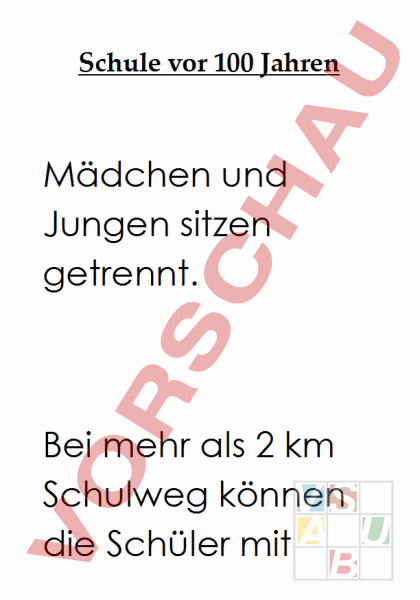 Schulregeln und Fakten sollen der Schule vor 100 Jahren und der heutigen Schule zugeordnet werden. Auf zehn Seiten stehen immer zwei Fakten/Regeln, sie können in dieser Größe ausgedruckt und an die Tafel geheftet werden. Dazu gibt es ein Lösungsblatt.