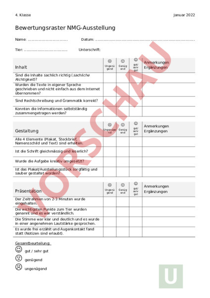 4. Klasse Januar 2022 Bewertungsraster NMG-Ausstellung Name: . Tier: Datum: Unterschrift: Inhalt Ungenü gend Genüg end Ungenüge nd Genüg end Ungenü gend Genüg end gut/ sehr gut Anmerkungen Ergänzungen Sind die Inhalte sachlich richtig (sachliche Richtigkeit)? Wurden die Texte in eigener Sprache geschrieben und nicht einfach aus dem Internet übernommen? Sind Rechtschreibung und Grammatik korrekt? Konnten die Informationen selbstständig zusammengetragen werden? Gestaltung gut/ sehr gut Anmerkungen Ergänzungen Alle 4 Elemente (Plakat, Steckbrief, Namensschild und Text) sind erhalten. Ist die Schrift gleichmässig und leserlich? Wurde die Aufgabe kreativ umgesetzt? Ist das Plakat/Ausstellungsstück sorgfältig und sauber gestaltet worden? Präsentation Der Zeitrahmen von 2-3 Minuten wurde eingehalten. Die wichtigsten Punkte zum Tier wurden genannt und es war verständlich. Die Stimme war klar und deutlich und es wurde in einer angenehmen Lautstärke gesprochen. Es wurde frei erzählt und Augenkontakt fand statt (Notizen sind erlaubt). Gesamtbeurteilung: gut sehr gut genügend ungenügend gut/ sehr gut Anmerkungen Ergänzungen