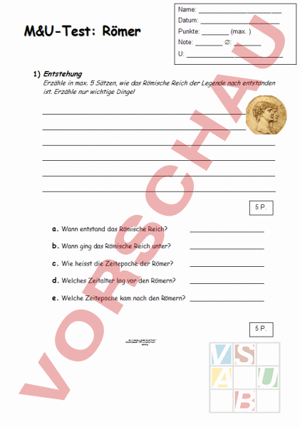 Name: Datum: M&U-Test: Römer Punkte: (max. Note: : U: 1) Entstehung Erzähle in max. 5 Sätzen, wie das Römische Reich der Legende nach entstanden ist. Erzähle nur wichtige Dinge! 5 P. a. Wann entstand das Römische Reich? b. Wann ging das Römische Reich unter? c. Wie heisst die Zeitepoche der Römer? d. Welches Zeitalter lag vor den Römern? e. Welche Zeitepoche kam nach den Römern? 5 P. Zur Anzeige wird der QuickTime Dekompressor „TIFF (Unkomprimiert) benötigt. 2) Römisches Reich a. Zeichne auf der Karte das Römische Reich mit Farbstift ein. 3 P. b. Unter welchem Kaiser war die Ausdehnung des Reiches am grössten? c. Welches war die Hauptstadt des Römischen Reiches und in welchem Land liegt sie? d. Römische Ortschaften gab es auch im Gebiet der heutigen Schweiz. Welche heutigen Ortschaften trugen diese römischen Namen? Basilia Curia Turicum 5 P. 3) Herrschaft a. Schreibe die fehlenden Namen hinein. Lange Zeit wurde die Stadt Rom von Königen regiert. Nach dem Sturz des letzten Königs im Jahre 510 v. Chr. wurde die Stadt von zwei regiert. Diese wurden von den gewählt. b. Wie hiess das arme Volk? c. Wie hiess das reiche Volk? d. Wer war auf den röm. Münzen abgebildet? 5 P. e. Cäsar: Kreuze die richtigen Behauptungen an! Cäsar voller Name war f. Galius Julius Caius Julius Caius Julian Cäsar teilte sich die Macht mit einem anderen Kaiser. Cäsar herrschte alleine über Rom ( Diktator). Er liess römische Senatoren ermorden. Cäsar begann Selbstmord, da er keine Macht mehr hatte. Cäsar wurde von den Germanen ermordet. Cäsar wurde von römischen Senatoren ermordet. Nenne 4 weitere Kaiser: 8 P. Gruppenthemen 4) Religion a. Wie hiess der Vater und König der Götter? b. Wie hiess der Kriegsgott? c. Über was wachten die nationalen Götter? d. Über was wachten die Hausgötter? e. Nenne noch zwei weitere Götter: 7 P. f. Glaubten die Römer – wie die Christen heute an einen einzelnen Gott? Begründe deine Antwort! 2 P. 5) Handel und Verkehr a. Wie hiess die erste römische Strasse? b. Mit welchen Waren handelten die Römer? Zähle 4 auf! c. Die Römer hatten Karren, welche von Pferden oder Ochsen gezogen wurden. Mit welchen Verkehrsmitteln handelten die Römer auch noch? d. Zähle 2 Berufe auf, die es zur Römerzeit schon gab. 8 P. 6) Bauten a. Bäder Die römischen Bäder hiessen. 1 P. b. Hausbau Setze folgende Wörter in die richtigen Lücken ein. Glas Glasscheiben Heizung Keller Mauern Reiche Stockwerken Thermen Villa Ziegelsteinen Die Römer führten grundlegende Dinge ein, die wir heute noch beim Hausbau berücksichtigen. Zum Beispiel erstellten sie aus behauenen oder gebrannten. Auch für das Dach werden seit der Römerzeit Ziegel verwendet. Außerdem konnten die Römer bereits herstellen; sie bauten Fenster mit ein. Das Römerhaus bestand häufig aus mehreren, manchmal gab es auch einen. Römer konnten sich in ihrer sogar eine leisten. Diese hatten die Römer für ihre entwickelt. 5 P. c. Heizung Betrachte folgende Darstellung und erkläre mit Hilfe davon, wie die römische Heizung funktionierte. (max. 5 Sätze) 3 P. d. Wasserleitungen Die Wasserleitungen mussten so angelegt sein, dass das Wasser immer ein leichtes hatte. Zeichne folgende Darstellung weiter. Beschrifte sie mit den Wörtern: Tunnel Verteilerbecken Aquädukt Quelle, Fluss 5 P. Fliessrichtung 7) Militär a. Ausrüstung eines Legionärs. Bezeichne möglichst genau! 1. 1 2. 6 3. 5 4. 3 5. 2 4 6. b. Was ist der Limes? 7 P. 8) Alltag a. Kleidung Wie nennt man das „Grundkleid der Römer? Wer durfte nur dieses Grundkleid tragen? Wer durfte die Stola tragen? Wohlhabende Römer trugen noch Wohlhabende Römerinnen trugen noch Aus welchem Material bestand der Schmuck? 6 P. b. Unterhaltung Sind die folgenden Aussagen richtig oder falsch? Kreuze an! richtig Die Römer fanden Gladiatorenspiele grausam. falsch Gladiatoren mussten auch gegen wilde Tiere kämpfen. Die Spiele fanden im Circus Maximus statt. Die Spiele fanden im Kolosseum statt. Beschrifte folgende Bauwerke mit dem richtigen Namen: 2 P. 3 P. c. Schule Die Kinder lernten in der Schule die Sprache. Man schrieb fast immer auf. Nur die 3 P. gingen zur Schule. d. Römische Zahlen: Wie heissen folgende römische Zahlen bei uns? CD CDXXIII 2 P.