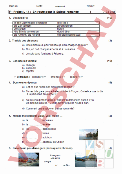 Datum: Note: Name: Unterschrift: F– Probe: 14 En route pour la Suisse romande 1. Vocabulaire: 34 pts) (10) in den Bahnwagen einsteigen die Zeit vergeht umsteigen Alle Billette vorweisen! die Ankunft, die Abfahrt die Reise zurückkehren hören dort drüben ein Städteschnellzug 2. Traduis ces phrases (3) a) Dites monsieur, pour Genève je dois changer de train b) Oui, on doit changer à Berne et à Lausanne. c) Je suis dans lautobus à Fribourg. 3. Conjuge les verbes (10) a) changer b) entendre c) répéter et traduis changer ? entendre ? répéter ? 4. Donne une réponse: (4) a) Est-ce que André sait bien parler français b) Tu vas à la gare pour acheter un billet à Torgon. Quest-ce que tu dis à la personne au guichet c) Au bureau dinformation à Fribourg tu demandes quand il a un autobus à Bulle. Tu veux savoir à quelle heure il part. d) Comment on se salue en Suisse romande? 5. Mets le mot correct: vieux, vieil, vieille (3) a) le . monsieur b) la . fenêtre c) les demoiselles d) l trains e) l autobus f) .château de Chillon 6. Raconte un peu dune gare (écris quatre phrases). Exemples Les gares dAigle et de Bex (4) Datum: Note: Unterschrift: F– Probe: 14 En route pour la Suisse romande 1. Name: Solution 34 pts) Vocabulaire: (10) entre en voiture le temps passe changer de train Présentez tous les billets! larrivée, le départ le voyage retourner à entendre là-bas un (train) intercity 2. Traduis ces phrases (3) Sagen Sie mein Herr, muss ich nach Genf umsteigen? Ja, man muss in Bern und Lausanne umsteigen. Ich bin im Autobus nach Freiburg. 3. Conjuge les verbes (10) a) je change, tu changes, il change, nous changeons, vous changez, ils changent (je3) b) jentends, tu entends, il entend, nous entendons, vous entendez, ils entendent c) je répète, tu répètes, il répète, nous répétons, vous répétez, ils répètent et traduis changer wechseln entendre hören répéter wiederholen (,,) 4. Donne une réponse: (4) a) Non, André ne sait pas bien le français. b) Bonjour – il me faut un billet pour Torgon et retour en deuxième classe. c) Bonjour, à quelle heure part un autobus pour Bulle d) On se dit salut et on sembrasse aussi. 5. Mets le mot correct: vieux, vieil, vieille (3) a) le vieux monsieur b) la vieille fenêtre c) les vieilles demoiselles d) les vieux trains e) le vieil autobus f) le vieux château de Chillon 6. Raconte un peu dune gare (écris quatre phrases). Exemples Les gares dAigle et de Bex (4)