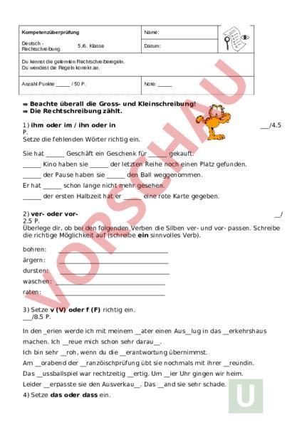 Kompetenzüberprüfung Name: Deutsch Rechtschreibung Datum: 5./6. Klasse Du kennst die gelernten Rechtschreiberegeln. Du wendest die Regeln korrekt an. Anzahl Punkte 50 P. Note: Beachte überall die Gross- und Kleinschreibung! Die Rechtschreibung zählt. 1) ihm oder im ihn oder in P. Setze die fehlenden Wörter richtig ein./4.5 Sie hat Geschäft ein Geschenk für gekauft. Kino haben sie der letzten Reihe noch einen Platz gefunden. der Pause haben sie den Ball weggenommen. Er hat schon lange nicht mehr gesehen. der ersten Halbzeit hat er eine rote Karte gegeben. 2) ver- oder vor/ 2.5 P. Überlege dir, ob bei den folgenden Verben die Silben ver- und vor- passen. Schreibe die richtige Möglichkeit auf (schreibe ein sinnvolles Verb). bohren: ärgern: dursten: waschen: raten: 3) Setze (V) oder (F) richtig ein./8.5 P. In denerien werde ich mit meinem ater einen Auslug in das erkehrshaus machen. Ich reue mich schon sehr darau. Ich bin sehr roh, wenn du die erantwortung übernimmst. Am orabend der ranzöischprüfung übt sie nochmals mit ihrer reundin. Das ussballspiel war rechtzeitig ertig. Um ier Uhr gingen wir heim. Leider erpasste sie den Ausverkau. Das and sie sehr schade. 4) Setze das oder dass ein. Denke daran: „dass kann nicht ersetzt werden./6 P. bedeutet, du nochmals üben musst. wunderschöne Geschenk, ich zum Geburtstag bekommen habe, gefällt mir. Sie hoffen, Wetter bald besser wird. Max hat Gefühl, er verfolgt wird. Klara weiss, sie Geld in der Badi verloren hat. Sie findet Buch nicht mehr, sie ausgeliehen hat. 5) Setze den oder denn ein. Denke daran: „denn kann nicht ersetzt werden./ 6 P. Beim Unwetter ist ihnen nichts passiert, sie waren bereits in Sicherheit. Urs hat Ball, er gefunden hat, dem Besitzer zurückgegeben. Ich erkenne Hund des Nachbarn sofort, er hat weisse Ohren. Sandra hat Pullover, sie gekauft hat, ihrer Schwester gegeben, er war ihr zu klein. Er bekommt eine Strafe, er ist zu spät gekommen. Sie waren alle sehr müde, sie sind lange durch Wald gerannt. Im Zoo haben sie jungen Seeleoparden gesehen. 6) Setze war oder wahr ein./3.5 P. Hans hat dem Lehrer die heit gesagt. Sie im Kino und der Film sehr spannend. Das zeichen von Paris ist der Eiffelturm. Wegen dem starken Regen er ganz nass. Der Film nach einer Geschichte geschrieben. 7) Setze seid oder seit ein. P. Die Familie Müller wohnt drei Jahren in Basel. Wie ich vernommen habe, ihr zwei Wochen in den Ferien. gestern hat Sandro starke Magenschmerzen. Die Schulklasse ist zehn Uhr im Schwimmbad. drei Wochen ist die Katze nicht mehr nach Hause gekommen./3 8) Setze wieder oder wider ein./ 3.5 P. Die Schüler sind froh, dass sie den Test holen dürfen. Max sprach dem Lehrmeister immer . willig räumte Sonja ihr Zimmer auf. Der Lehrer holte das Diktat noch einmal. Die eröffnung des Lokals führte zu grossem stand. 9) Setze eu oder äu in die Lücken./4 P. Der Augenzge konnte den Rber sehr genau beschreiben. Die lauten Gersche der Flugzge stören die Anwohner. In der Schne befinden sich einele und ein K_zchen. Das Buch hatte eine bl_liche Farbe. 10) Setze oder ä in die Lücken./2.5 P. Sie genossen das pr_chtige Wetter. Dierztin begrüsste den b_rtigen Mann. Er zw_ngte sich in die Höhle hinein. Beim Metzger kauften sie sich ein Brath_hnche. 11) Setze ie oder in die Lücke./6 P. Im Zoo haben s die Krokodle angeschaut. Es stmmt, dass nächste Woche der Magr in die Schule kommt. Sandra hat einen Vortrag über einen Tger gehalten. W macht er das, dass er immer wder der Schnellste ist? Es ist wchtig, dass Plastk richtig entsorgt wrd. Der Torwart hat den Sg verhndert. Lernaufwand Ergebnis Ich habe. Ich konnte die Prüfung. sehr viel sehr gut viel gut mittelmässig mittelmässig ganz wenig gar nicht ungenügend . gelernt. . lösen.