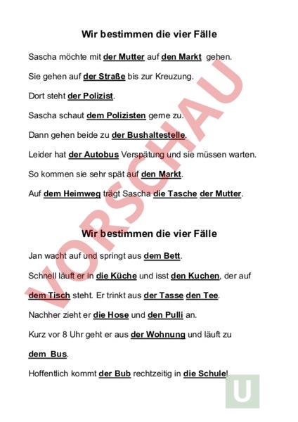 Wir bestimmen die vier Fälle Sascha möchte mit der Mutter auf den Markt gehen. Sie gehen auf der Straße bis zur Kreuzung. Dort steht der Polizist. Sascha schaut dem Polizisten gerne zu. Dann gehen beide zu der Bushaltestelle. Leider hat der Autobus Verspätung und sie müssen warten. So kommen sie sehr spät auf den Markt. Auf dem Heimweg trägt Sascha die Tasche der Mutter. Wir bestimmen die vier Fälle Jan wacht auf und springt aus dem Bett. Schnell läuft er in die Küche und isst den Kuchen, der auf dem Tisch steht. Er trinkt aus der Tasse den Tee. Nachher zieht er die Hose und den Pulli an. Kurz vor 8 Uhr geht er aus der Wohnung und läuft zu dem Bus. Hoffentlich kommt der Bub rechtzeitig in die Schule! Wir bestimmen die vier Fälle Gestern ist Klaus in die Stadt gegangen. Auf der Straße hat er den Onkel und die Tante getroffen. Er hat die Tante gefragt, wie es der Großmutter geht. Hoffentlich kommt die Oma bald aus dem Spital. Sonst wird der Bub die Großmutter dort besuchen. Wer kümmert sich denn jetzt um den Hund der Oma? Das macht in der nächsten Zeit die Nachbarin. Die vier Fälle des sächlichen Namenwortes Heute kommt das Mädchen nicht in die Schule. Die Frau Lehrerin sucht die Telefonnummer des Mädchens. Dann ruft sie bei den Eltern des Mädchens an. Sie erfährt, dass das Mädchen hohes Fieber hat. Bald wird der Arzt zu dem Mädchen kommen. Er wird das Mädchen genau untersuchen. Hoffentlich muss das Mädchen nicht ins Spital kommen. Die Frau Lehrerin wünscht dem Mädchen baldige Besserung. Heute in der Nacht war der Nikolaus da. Roland und Magdalena wachten zeitig in der Früh auf. Sofort liefen die Kinder zum Fenster des Kinderzimmers. Dort standen die Schuhe, die sie am Abend auf die Fensterbretter gestellt hatten. Darin lagen auch die Dinge, die sich die Kinder gewünscht hatten. Der Bub entdeckte den Schokoladenikolo, während das Mädchen sofort die Mandarinen fand. Ganz unten in den Schuhen des Buben sah er aber die Kohlen. War vielleicht auch der Krampus in der Nacht da?