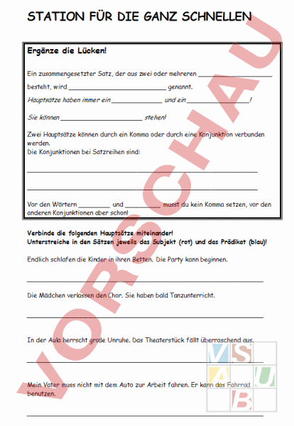 STATION FÜR DIE GANZ SCHNELLEN Ergänze die Lücken! Ein zusammengesetzter Satz, der aus zwei oder mehreren besteht, wird genannt. Hauptsätze haben immer ein und ein ! Sie können stehen! Zwei Hauptsätze können durch ein Komma oder durch eine Konjunktion verbunden werden. Die Konjunktionen bei Satzreihen sind: Vor den Wörtern und musst du kein Komma setzen, vor den anderen Konjunktionen aber schon! Verbinde die folgenden Hauptsätze miteinander! Unterstreiche in den Sätzen jeweils das Subjekt (rot) und das Prädikat (blau)! Endlich schlafen die Kinder in ihren Betten. Die Party kann beginnen. Die Mädchen verlassen den Chor. Sie haben bald Tanzunterricht. In der Aula herrscht große Unruhe. Das Theaterstück fällt überraschend aus. Mein Vater muss nicht mit dem Auto zur Arbeit fahren. Er kann das Fahrrad benutzen.