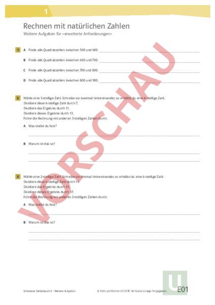 1 Rechnen mit natürlichen Zahlen Weitere Aufgaben für « erweiterte Anforderungen » 1 Finde alle Quadratzahlen zwischen 500 und 600. Finde alle Quadratzahlen zwischen 600 und 700. Finde alle Quadratzahlen zwischen 700 und 800. Finde alle Quadratzahlen zwischen 800 und 900. 2 Wähle eine 3-stellige Zahl. Schreibe sie zweimal hintereinander, so erhältst du eine 6-stellige Zahl. Dividiere diese 6-stellige Zahl durch 7. Dividiere das Ergebnis durch 11. Dividiere dieses Ergebnis durch 13. Führe die Rechnung mit anderen 3-stelligen Zahlen durch. Was stellst du fest Warum ist das so 3 Wähle eine 2-stellige Zahl. Schreibe sie dreimal hintereinander, so erhältst du eine 6-stellige Zahl. Dividiere diese 6-stellige Zahl durch 13. Dividiere das Ergebnis durch 21. Dividiere dieses Ergebnis durch 37. Führe die Rechnung mit anderen 2-stelligen Zahlen durch. Was stellst du fest Warum ist das so Schweizer Zahlenbuch 6 · Weitere Aufgaben Klett und Balmer AG 2018. Als Kopiervorlage freigegeben. E01