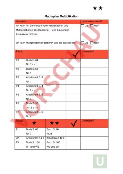Matheplan Multiplikation Lernziele: Lernziele erreicht? Ich kann mit Zehnerpotenzen vervielfachen und Ja Nein Ja Nein Multiplikationen des Hunderter – und TausenderEinmaleins rechnen Ich kann Multiplikationen sortieren und sie ausrechnen Pflicht P1 Unterschrift Buch S. 64 Nr. 3 - P2 Buch S. 65 Nr. 4 P3 Arbeitsheft S. 3 Nr.1 P4 Arbeitsheft S. 4 Nr. 2 -i P5 Arbeitsheft S. 5 Nr. 3 P6 Buch S. 56 Nr. 6 - P7 Arbeitsheft S. 6 Nr. 4 Zusatz Z1 Unterschrift Buch S. 66 Buch S. 66 Nr. 7 Nr. 9 Z2 Arbeitsblatt 14.1 Arbeitsblatt 14.2 Z3 Buch S. 160 Buch S. 160 W1 und W2 W3 und W4 Matheplan Multiplikation Lernziele: Lernziele erreicht? Ich kann mit Zehnerpotenzen vervielfachen und Ja Nein Ja Nein Multiplikationen des Hunderter – und TausenderEinmaleins rechnen Ich kann Multiplikationen sortieren und sie ausrechnen Pflicht P1 Unterschrift Buch S. 64 Nr. 3 und P2 Buch S. 65 Nr. 4 P3 Arbeitsheft S. 3 Nr.1 - P4 Arbeitsheft S. 4 Nr. 2 -f P5 Arbeitsheft S. 5 Nr. 3 -d P6 Buch S. 56 Nr. 6 und P7 Arbeitsheft S. 6 Nr. 4 Zusatz Z1 Unterschrift Buch S. 66 Buch S. 66 Nr. 7 Nr. 9 Z2 Arbeitsblatt 14.1 Arbeitsblatt 14.2 Z3 Buch S. 160 Buch S. 160 W1 und W2 W3 und W4 Montag 08:20-09:05 09:10-09:55 10:15-11:00 Donnerstag Freitag Englisch Zeichnen Zeichnen Englisch 11:05-11:50 Gruppe 13:30 – 14:15 Englisch 14:20 – 15:05 Sport 15:20 – 16:05 Mittwoch Schwimmen Frau Lerch 07:30-08:15 Dienstag Frau Lerch Zeit Frau Lerch Stundenplan Gruppe Forscherzone Denkinsel Code-Fächer Selbsteinschätzung Wie hat die Arbeit mit dem Matheplan geklappt? Wie habe ich die Kompetenzziele erreicht? Das hat mir besonders gut gefallen: Das muss ich noch üben: Malen nach Zahlen