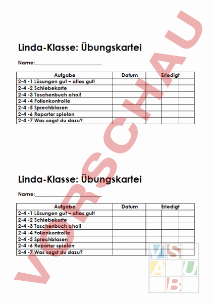 Linda-Klasse: Übungskartei Name: Aufgabe 2-4 -1 Lösungen gut – alles gut! 2-4 -2 Schiebekarte 2-4 -3 Taschenbuch ahoi! 2-4 -4 Folienkontrolle 2-4 -5 Sprechblasen 2-4 -6 Reporter spielen 2-4 -7 Was sagst du dazu? Datum Erledigt Linda-Klasse: Übungskartei Name: Aufgabe 2-4 -1 Lösungen gut – alles gut! 2-4 -2 Schiebekarte 2-4 -3 Taschenbuch ahoi! 2-4 -4 Folienkontrolle 2-4 -5 Sprechblasen 2-4 -6 Reporter spielen 2-4 -7 Was sagst du dazu? Datum Erledigt