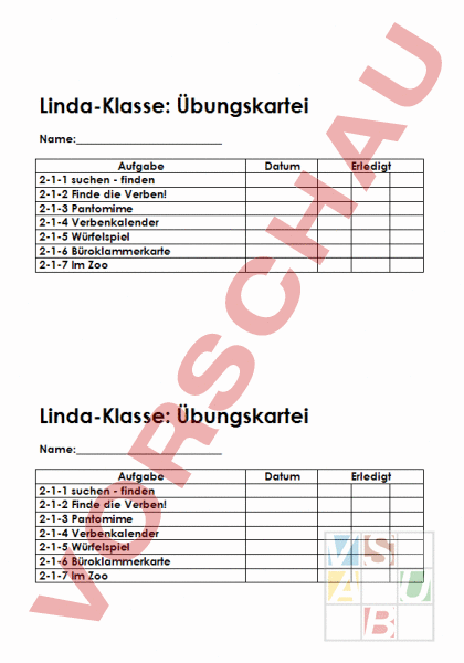 Linda-Klasse: Übungskartei Name: Aufgabe 2-1-1 suchen finden 2-1-2 Finde die Verben! 2-1-3 Pantomime 2-1-4 Verbenkalender 2-1-5 Würfelspiel 2-1-6 Büroklammerkarte 2-1-7 Im Zoo Datum Erledigt Linda-Klasse: Übungskartei Name: Aufgabe 2-1-1 suchen finden 2-1-2 Finde die Verben! 2-1-3 Pantomime 2-1-4 Verbenkalender 2-1-5 Würfelspiel 2-1-6 Büroklammerkarte 2-1-7 Im Zoo Datum Erledigt