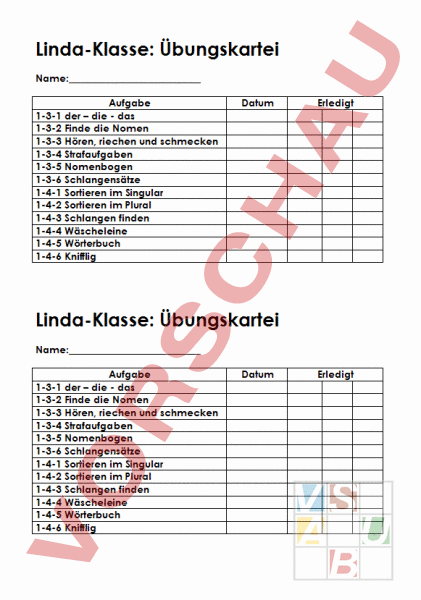 Übungskarteikarten für die Linda Klasse Übungskartei