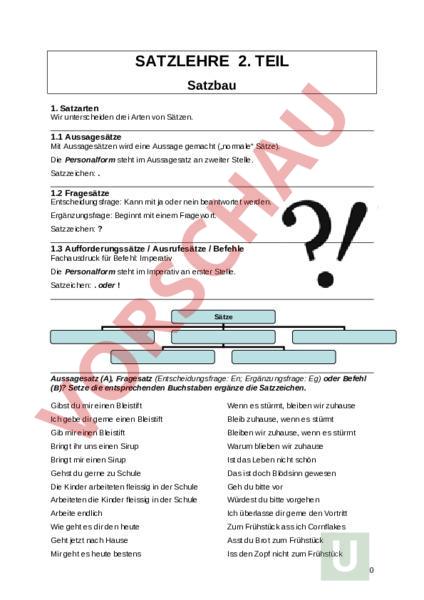SATZLEHRE 2. TEIL Satzbau 1. Satzarten Wir unterscheiden drei Arten von Sätzen. 1.1 Aussagesätze Mit Aussagesätzen wird eine Aussage gemacht („normale Sätze). Die Personalform steht im Aussagesatz an zweiter Stelle. Satzzeichen: 1.2 Fragesätze Entscheidungsfrage: Kann mit ja oder nein beantwortet werden. Ergänzungsfrage: Beginnt mit einem Fragewort. Satzzeichen: 1.3 Aufforderungssätze Ausrufesätze Befehle Fachausdruck für Befehl: Imperativ Die Personalform steht im Imperativ an erster Stelle. Satzeichen: oder Sätze Aussagesatz (A), Fragesatz (Entscheidungsfrage: En; Ergänzungsfrage: Eg) oder Befehl (B)? Setze die entsprechenden Buchstaben ergänze die Satzzeichen. Gibst du mir einen Bleistift Wenn es stürmt, bleiben wir zuhause Ich gebe dir gerne einen Bleistift Bleib zuhause, wenn es stürmt Gib mir einen Bleistift Bleiben wir zuhause, wenn es stürmt Bringt ihr uns einen Sirup Warum blieben wir zuhause Bringt mir einen Sirup Ist das Leben nicht schön Gehst du gerne zu Schule Das ist doch Blödsinn gewesen Die Kinder arbeiteten fleissig in der Schule Geh du bitte vor Arbeiteten die Kinder fleissig in der Schule Würdest du bitte vorgehen Arbeite endlich Ich überlasse dir gerne den Vortritt Wie geht es dir den heute Zum Frühstück ass ich Cornflakes Geht jetzt nach Hause Asst du Brot zum Frühstück Mir geht es heute bestens Iss den Zopf nicht zum Frühstück 0 SATZLEHRE 2. TEIL Satzbau 1. Satzarten Wir unterscheiden drei Arten von Sätzen. 1.1 Aussagesätze Mit Aussagesätzen wird eine Aussage gemacht („normale Sätze). Die Personalform steht im Aussagesatz an . Satzzeichen: 1.2 Fragesätze Entscheidungsfrage: Ergänzungsfrage: Satzzeichen: 1.3 Aufforderungssätze Ausrufesätze Befehle Fachausdruck für Befehl: Imperativ Die Personalform steht im Imperativ an . Satzeichen: Sätze Aussagesatz (A), Fragesatz (Entscheidungsfrage: En; Ergänzungsfrage: Eg) oder Befehl (B)? Setze die entsprechenden Buchstaben ergänze die Satzzeichen. Gibst du mir einen Bleistift Wenn es stürmt, bleiben wir zuhause Ich gebe dir gerne einen Bleistift Bleib zuhause, wenn es stürmt Gib mir einen Bleistift Bleiben wir zuhause, wenn es stürmt Bringt ihr uns einen Sirup Warum blieben wir zuhause Bringt mir einen Sirup Ist das Leben nicht schön Gehst du gerne zu Schule Das ist doch Blödsinn gewesen Die Kinder arbeiteten fleissig in der Schule Geh du bitte vor Arbeiteten die Kinder fleissig in der Schule Würdest du bitte vorgehen Arbeite endlich Ich überlasse dir gerne den Vortritt Wie geht es dir den heute Zum Frühstück ass ich Cornflakes Geht jetzt nach Hause Asst du Brot zum Frühstück Mir geht es heute bestens Iss den Zopf nicht zum Frühstück 1 Die Sätze haben einen sprachlichen Bau, nach dem wir einfache Sätze und zusammengesetzte Sätze unterscheiden. 1. Einfache Sätze Ein einfacher Satz enthält eine einzige Personalform. Ihnen liegt nur eine verbale Wortkette zugrunde. Jeder einfache Satz ist ein Hauptsatz. Beispiele: Bea schreibt. Bea schreibt seit zwei Stunden. Seit zwei Stunden schreibt Bea an ihrem Brief. Seit zwei Stunden schreibt Bea an ihrem Brief an ihre Freundin. 2. Zusammengesetzte Sätze Satzreihen Zusammengesetzte Sätze sind Sätze, die aus mehreren Teilsätzen bestehen. Jedem Teilsatz (TS) liegt eine verbale Wortkette zugrunde, d.h. ein Teilsatz hat eine Personalform. Beispiele: Bea schreibt, sie freut sich auf die Ferien. Bea schreibt einen Brief und bringt ihn zur Post. Wenn wir ihren Brief gelesen haben, werden wir bestimmt mehr darüber wissen. Kurswechsel Kapitän Wittstamm wartete die drei schweren Stösse im Vorschiff ab. Dann lief er mit kurzen Trippelschritten über das Deck. Unter dem Schutzdach der Netzwinde blieb er stehen und klammerte sich an. Das Wasser des Brechers schoss auf ihn zu und riss ihm die Beine unter dem Körper weg. Der Kapitän versuchte nicht, mit den Seestiefeln wieder Halt zu bekommen. Er nahm die Kraft seines Körpers zusammen und schickte sie mit einer ungeheuren Im Text kommen einfache Sätze und zusammengesetzte Sätze vor. Markiere die verbalen Teile. Unterstreiche die Personalform doppelt und die übrigen verbalen Teil einfach. Übermale die einfachen Sätze mit einem Leuchtstift. Markiere die einzelnenTeilsätze, indem du sie überklammerst. Willensanstrengung nur in Arme und Hände. Zwei Wittstamm konnte sich noch anklammern, Sekunden lang war Kapitän Wittstamm eine bevor sich der Brecher über ihn ergoss. menschliche Fahne, die im Gischt des Brechers flatterte. Jetzt verlief sich das graugrüne Wasser. 2 Aufgabe zur Bestimmung der Teilsätze. Markiere die verbalen Teile. Unterstreiche die Personalform doppelt und die übrigen verbalen Teil einfach. Übermale die einfachen Sätze mit einem Leuchtstift. Markiere die einzelnenTeilsätze, indem du sie überklammerst. Eines Tages, als der Sultan auf dem Ruhebett seines Palastes in Damaskus lag, stürzte ein schöner Jüngling, sein Lieblingsdiener, in das Gemach. Er fiel auf die Knie, er schrie in Aufre gung, dass er sofort nach Bagdad fliehen müsse. Er bat eindringlich um das schnellste Pferd Seiner Majestät. Warum musst du so schnell nach Bagdad?, fragte der Sultan. Der Diener antwortete: So eben habe ich im Garten des Palastes den Tod stehen gesehen, und wie er mich bemerkte, streckte er seine Arme drohend nach mir aus. Ich muss ihm eiligst entkommen. Der Sultan gab ihm das Pferd, und der Jüngling sprengte davon. Dann aber schritt der Sultan zornig in den Garten. Den Tod fand er immer noch dort stehen. Wie wagst du es, meinem Lieblingsdiener zu drohen?, schrie der Sultan. Der Tod jedoch antwortete völlig verblüfft: Ich versichere Eurer Majestät, dass ich ihm nicht gedroht habe. Ich warf bloss meine Arme in die Luft, weil ich erstaunt war, ihn hier zu sehen, denn ich habe ja mit ihm heute Nacht ein Stelldichein in Bagdad. Nach Sigismund von Radecki In einer Schule war einmal ein kleiner Geldbetrag entwendet worden. Für den Diebstahl kamen fünf Achtjährige in Frage
