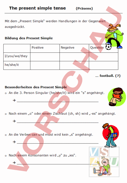 The present simple tense (Präsens) Mit dem „Present Simple werden Handlungen in der Gegenwart ausgedrückt. Bildung des Present Simple Positive Negative Question I/you/we/they he/she/it football. (?) Besonderheiten des Present Simple An die 3. Person Singular (he/she/it) wird ein angehängt. Nach einem „o oder einem Zischlaut (ch, sh) wird „-es angehängt. An die Verben can und must wird kein „s angehängt. Nach einem Konsonanten wird „y zu „ies.