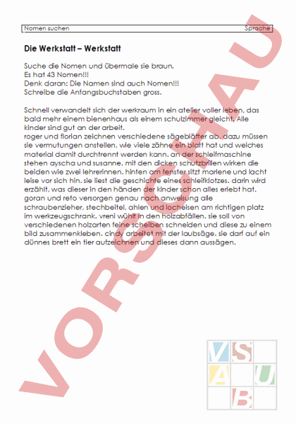 Nomen suchen Sprache Die Werkstatt – Werkstatt Suche die Nomen und übermale sie braun. Es hat 43 Nomen!!! Denk daran: Die Namen sind auch Nomen!!! Schreibe die Anfangsbuchstaben gross. Schnell verwandelt sich der werkraum in ein atelier voller leben, das bald mehr einem bienenhaus als einem schulzimmer gleicht. Alle kinder sind gut an der arbeit. roger und florian zeichnen verschiedene sägeblätter ab. dazu müssen sie vermutungen anstellen, wie viele zähne ein blatt hat und welches material damit durchtrennt werden kann. an der schleifmaschine stehen ayscha und susanne. mit den dicken schutzbrillen wirken die beiden wie zwei lehrerinnen. hinten am fenster sitzt marlene und lacht leise vor sich hin. sie liest die geschichte eines schleifklotzes. darin wird erzählt, was dieser in den händen der kinder schon alles erlebt hat. goran und reto versorgen genau nach anweisung alle schraubenzieher, stechbeitel, ahlen und locheisen am richtigen platz im werkzeugschrank. vreni wühlt in den holzabfällen. sie soll von verschiedenen holzarten feine scheiben schneiden und diese zu einem bild zusammenkleben. cindy arbeitet mit der laubsäge. sie darf auf ein dünnes brett ein tier aufzeichnen und dieses dann aussägen.
