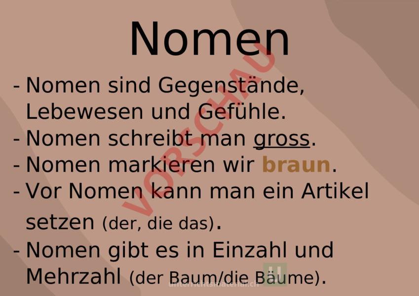 Nomen Nomen sind Gegenstände, Lebewesen und Gefühle. Nomen schreibt man gross. Nomen markieren wir braun. Vor Nomen kann man ein Artikel setzen (der, die das). Nomen gibt es in Einzahl und Mehrzahl (der Baum/die Bäume). Beispiele: der Baum, die Suppe, das Glück, Paul