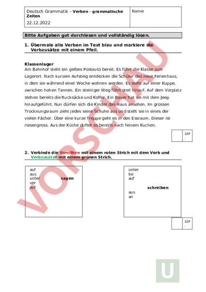 Deutsch Grammatik – Verben – grammatische Name: Zeiten 22.12.2022 Bitte Aufgaben gut durchlesen und vollständig lösen. 1. Übermale alle Verben im Text blau und markiere die Verbzusätze mit einem Pfeil. Klassenlager Am Bahnhof steht ein gelbes Postauto bereit. Es führt die Klasse zum Lagerort. Nach kurzem Aufstieg entdecken die Schüler das neue Ferienhaus, in dem sie während einer Woche wohnen werden. Es steht auf einer Kuppe, zwischen hohen Tannen. Ein steiniger Weg führt steil hinauf. Auf dem Vorplatz stehen bereits die Rucksäcke und Koffer. Ein Bauer hat sie mit dem Jeep hinaufgeführt. Nun dürfen sich die Kinder das Haus ansehen. Im grossen Trocknungsraum zieht jedes seine Schuhe aus und stellt sie in eines der vielen Fächer. Über eine kurze Treppe geht es in den Essraum. Dieser ist riesengross. Aus der Küche duftet es bereits nach feinem Kuchen. 10P 2. Verbinde die Vorsilben mit einem roten Strich mit dem Verb und Verbzusätze mit einem grünen Strich. auf aus unter ver auf sagen unter be auf schreiben aus an 10P Futur Plusquamp Präteritum Perfekt Präsens 3. Markiere im Satz die Verben und bestimme die Zeitform Ich trinke gerne ein Glas Milch vor dem schlafen. Mein Nachbar hatte sich letztes Jahr das Bein gebrochen. In den Weihnachtsferien werde ich ganz viel schlafen. Wolltest du nicht noch Schokolade mitbringen? Meine Mutter wird an meinem Geburtstag einen Kuchen backen. Markus konnte an der letzten Prüfung keine Aufgabe lösen. Ihr habt einen wunderschönen Schneemann gebaut. Meine Banknachbarin erklärt mir die Matheaufgaben sehr gut. Du fühlst dich wohl in der neuen Klasse. Die Lehrerin hatte die Prüfungen im Zug vergessen. 10P 4. Ergänze die Tabelle Präsens Perfekt Präteritum Plusquamperfekt Futur ich schreibe ich ich ich ich du du hast getrunken du du du er er er fiel er er ihr ihr ihr ihr wart gegangen Ihr wir wir wir wir wir werden vergessen. 10P Total: 40 P. 6 5.75 5.5 5.25 5 4.75 4.5 4.25 4 3.75 3.5 3.25 3 39 37 35 33 31 29 27 25 23 21 19 17 15