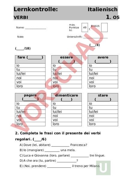 Arbeitsblatt: Italienisch Lernzielkontrolle Verben