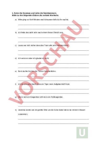 1. Setze die Kommas und ziehe die Satzklammern. Bilde zu den folgenden Sätzen die verbale Wortkette. a) Mike ging vor fünf Minuten nach draussen falls du ihn suchst. b) Ich finde das sieht sehr nach einem fiesen Streich aus. c) Laura war sich sicher dass das Tram alle zehn Minuten fährt. d) Ich weiss es aber ich glaube es nicht. e) Boris lachte bis ihm die Tränen hinunterliefen. f) Ich träume jede Nacht dass ein Tiger mein Aufgabenheft frisst. g) Wenn sich ein Kragenbär rollt ist es ein Rollkragenbär. h) Jasmina rannte wie ein geölter Blitz um die Ecke dabei stiess sie mit dem Abwart zusammen. 2. Mache aus zwei Sätzen einen ganzen Satz, indem du ein Bindewort gebrauchst. Peter schleckte am Eis. Das Eis fiel runter. Die Frau ging über die Strasse. Die Ampel hatte auf Grün geschaltet. Priska isst eine Tüte Chips. Sie schaut ihren Lieblingsfilm. 3. Setze die Kommas und ziehe die Satzklammern. Bilde zu den folgenden Sätzen die verbale Wortkette. Man lernt fremde Sprachen weil man sich dann im Ausland verständigen kann. Obwohl die englische Rechtschreibung schwierig ist lernt man diese Sprache leicht. Die französische Sprache die sehr schön klingt hat eine schwierige Grammatik. 4. Muss ein Komma vor das Bindewort oder nicht? Setze die Kommas und ziehe die Satzklammern Sollen wir wandern oder sollen wir Ski fahren? Mein Bruder liest und meine Schwester sieht fern. Ich konnte nichts einkaufen weil ich das Geld vergessen hatte. Ich habe sehr gefroren als ich gestern Abend nach Hause ging. Ich nehme meinen roten Regenmantel wenn es regnet. Möchtest du ein Brot oder möchtest du lieber einen Apfel? Ich glaube nicht dass es morgen schneit. Niemand hätte gedacht dass Ina ihre Bluse selbst genäht hat. Ich gehe nicht zur Tanzstunde weil ich keine Lust habe. Ich klettere über die Mauer und du gehst durch die Tür. Ich besuche dich wenn ich Zeit habe. 5. Ziehe im folgenden Text die Satzklammern. Vergiss nicht, die Kommas zwischen den Teilsätzen einzusetzen, und denke daran, dass «und» und «oder» das Komma ersetzen können. Bilde zu den folgenden Sätzen die verbale Wortkette. Endlich ist wieder Chilbizeit. Meine Freundin Anja und ich haben mit meinem Bruder gewettet dass ich mich dieses Jahr auf die Achterbahn getrauen werde. Nun stehe ich mit klopfendem Herzen vor der Kasse. Da ich mich nicht blamieren will kaufe ich schnell ein Billett und stelle mich dann in die Schlange. Anja grinst still vor sich hin weil sie genau weiss dass ich Angst habe. Plötzlich ist es so weit wir können einsteigen. Die Bügel werden geschlossen und schon beginnt die halsbrecherische Fahrt. Ich schliesse meine Augen. Höher und höher klettern die Wagen und auf einmal haben wir den höchsten Punkt erreicht. Die Wagen sausen mit atemberaubender Geschwindigkeit nach unten Kurve folgt um Kurve und zuletzt fahren wir noch einen Looping. Endlich verlangsamen sich die Wagen dann stehen wir still. Mit wackeligen Knien steige ich aus. Ich bin aber froh dass ich es geschafft habe. Stolz blicke ich Anja an. Jetzt muss uns mein Bruder eine Zuckerwatte spendieren.