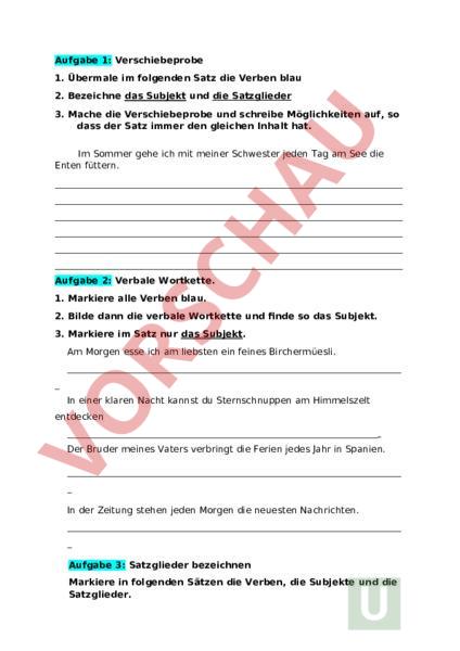 Aufgabe 1: Verschiebeprobe 1. Übermale im folgenden Satz die Verben blau 2. Bezeichne das Subjekt und die Satzglieder 3. Mache die Verschiebeprobe und schreibe Möglichkeiten auf, so dass der Satz immer den gleichen Inhalt hat. Im Sommer gehe ich mit meiner Schwester jeden Tag am See die Enten füttern. Aufgabe 2: Verbale Wortkette. 1. Markiere alle Verben blau. 2. Bilde dann die verbale Wortkette und finde so das Subjekt. 3. Markiere im Satz nur das Subjekt. Am Morgen esse ich am liebsten ein feines Birchermüesli. In einer klaren Nacht kannst du Sternschnuppen am Himmelszelt entdecken Der Bruder meines Vaters verbringt die Ferien jedes Jahr in Spanien. In der Zeitung stehen jeden Morgen die neuesten Nachrichten. Aufgabe 3: Satzglieder bezeichnen Markiere in folgenden Sätzen die Verben, die Subjekte und die Satzglieder. 1. Ich habe die Hausaufgaben gemacht, aber ich fand sie sehr schwierig. 2. Eine wissenschaftliche Studie hat ergeben, dass mit Kaugummikauen das Gehirn besser arbeitet. 3. Die Hühner gackerten nervös, als der Fuchs um den Stall schlich. 4. Wenn das Wetter gut ist, machen wir morgen einen Ausflug. Aufgabe 4: Satzglieder bezeichnen 1. Übermale oder unterstreiche alle Verben blau 2. Bezeichne (doppelt unterstreichen) die Subjekte mit roter Farbe. 3. Unterstreiche (Klammern setzen) die übrigen Satzglieder. Ein Backstein ist ein guter Bleistifthalter. Du klebst einen Karton auf die Unterseite und schon ist der Bleistifthalter fertig. Man kann jetzt Bleistifte und Kugelschreiber in die Löcher stecken. Konservenbüchsen sind ein guter Aufbewahrungsort für Kleinkram. Nun nimmt man einige gleich grosse Büchsen. Sie dürfen nur an einer Seite offen sein. Dann schraubt man sie dicht nebeneinander durch den Boden auf ein Brettchen. Am Schluss bekommt das Brettchen zwei Aufhängeösen. Aufgabe 5: Mit der Verschiebeprobe/ Umstellprobe Sätze veränder Aufgabe 6: Mit der Verschiebeprobe/ Umstellprobe Satzglieder bestimmen Aufgabe 7: Mit der Verschiebeprobe Wichtiges in Sätzen betonen Aufgabe 8: Teilsätze verbinden Aufgabe 9: Teilsätze erkennen und Kommas setzen Schreibe die Sätze ab und markiere alle Verben. Fasse mit einer Klammer diejenigen Wörter zusammen, die zu einem Verb gehören. Setze zwischen die Teilsätze ein Komma. Bsp: Katen zerkratzen Möbel seltener wenn sie einen Kletterbaum haben. Aufgabe 10: Lies den Beispielsatz gut durch und führe dann die vier verschiedenen Proben durch, die du kennst. Beispielsatz: Die Leute kaufen im Advent für ihre Kinder viele Geschenke ein. Probe 1: Probe 2: Probe 3: Probe 4: Aufgabe 11: Grenze die einzelnen Satzglieder mit einem Strich ab. Grundanforderungen: nur die gelben Sätze bearbeiten Erweiterte Anforderungen: alle Sätze bearbeiten a) Ein Mann begegnet vor einer Telefonkabine einem Pinguin. b) Er ruft sofort die Polizei an. c) Der Polizist antwortet gut gelaunt: d) „Bitte gehen Sie mit dem Pinguin noch heute in den Zoo. e) Am nächsten Tag ist der Polizist auf Streife. f) Auf der anderen Strassenseite entdeckt er plötzlich einen Mann mit einem Pinguin. g) Der Polizist denkt: h) „Er brachte den Pinguin offenbar gestern nicht in den Zoo. i) Der Mann mit dem Pinguin winkte dem Polizisten fröhlich zu. j) „Heute gehen wir zusammen ins Kino in der Stadt! Aufgabe 12: Satzglieder erkennen und Verschiebeprobe anwenden Umklammere im folgenden Satz alle Satzglieder. Übermale das Subjekt rot. Unterstreiche das Verb blau. Der Lehrer tanzt als Prinzessin verkleidet mit einem Einhorn um zwölf Uhr im Schulhaus. Wie viele Satzglieder hast du gefunden? Anzahl Satzglieder (ohne Verb): Stelle den Satz einmal um. (Achte auf die Rechtschreibung!) Aufgabe 13: Satzglieder erkennen Umklammere bei folgenden Sätzen alle Satzglieder und übermale das Subjekt rot. Das Verb unterstreichst du blau. Schreibe die passenden Fragewörter über die einzelnen Satzglieder. Wer? 1) Etwas unsicher steht Verena auf dem Waveboard. 2) Marianne zeigt ihrer kleinen Schwester einen Purzelbaum. 3) Vorsichtig hält sich der Junge fünf Minuten am Geländer fest.
