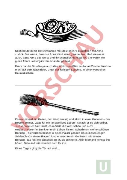 Noch heute denkt die Stirnlampe mit Stolz an ihre Expedition mit Anna zurück. Sie weiss, dass sie Anna das Leben gerettet hat. Und sie weiss auch, dass Anna das weiss und ihr unendlich dankbar ist. Sie waren ein gutes Team und ergänzten einander perfekt. Drum hat die Stirnlampe auch den schönsten Platz in Annas Zimmer bekom men: auf dem Nachttisch, unter der farbigen Leuchte, in einer wertvollen Keramikschale. Es war einmal ein Besen, der stand traurig und allein in einer Kammer – der Besenkammer. „Was für ein langweiliges Leben, sprach er zu sich selbst, „nie komme ich hier raus! Ich möchte die Welt sehen und nicht eingeschlossen im Dunklen mein Leben fristen. Schade um meine schönen Borsten – sie würden besser in einen Palast passen als in diesen engen Schlauch von einem Raum. Und er machte ein Geräusch mit seinen Borsten, das fast ein bisschen an Musik erinnerte. Aber niemand konnte ihn hören. Niemand interessierte sich für ihn. Eines Tages ging die Tür auf und .