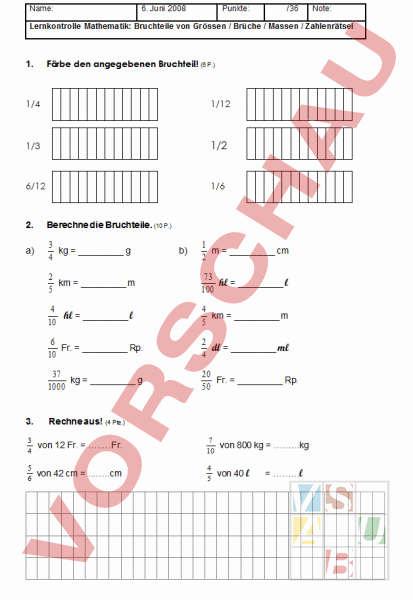 Name: 6. Juni 2008 Punkte: /36 Note: Lernkontrolle Mathematik: Bruchteile von Grössen Brüche Massen Zahlenrätsel Färbe den angegebenen Bruchteil! (6 P.) 1. 1/4 1/12 1/3 1/2 6/12 1/6 2. Berechne die Bruchteile. (10 P.) a) 3 kg 4 3. b) 1 cm 2 2 km 5 73 hl 100 4 hl 10 4 km 5 6 Fr. Rp. 10 2 dl ml 4 37 kg 1000 20 Fr. Rp. 50 Rechne aus! (4 Pte.) 3 4 von 12 Fr. Fr. 7 10 5 6 von 42 cm .cm 4 5 von 800 kg .kg von 40 l 4. 5. Schreibe mit Komma. (12 P.) Liter Kilogramm Liter 6 dl 38 9 cl 8 cl 3804 98 cl 675 ml 3 986 cl 280 cl 380 9865 cl Meter Liter Tonne 6 cm 8 dl 4 kg 60 cm 82 dl 47 kg 607 cm 825 dl 476 kg 6078 cm 8254 dl 4765 kg Zahlenrätsel (4 Pte.) a) Addiere zur Hälfte von 80 800 die Differenz von 15 786 und 7 978. Wie lautet diese Zahl? Antwort: b) Wenn du von einer Zahl 12 636 subtrahierst, erhältst du das Doppelte von 18 500. Wie heisst diese Zahl? Antwort: Ausrechnungen: Viel Glück!