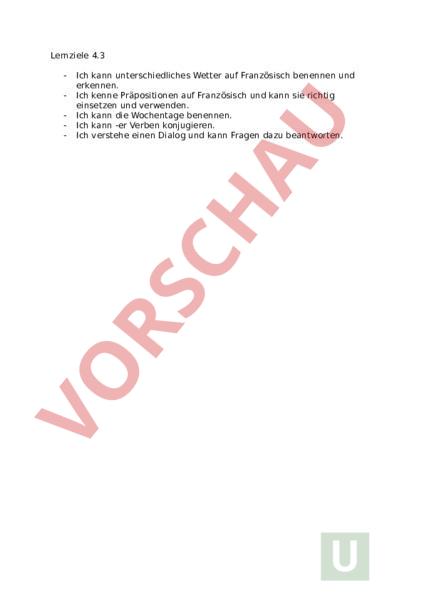 Lernziele 4.3 Ich kann unterschiedliches Wetter auf Französisch benennen und erkennen. Ich kenne Präpositionen auf Französisch und kann sie richtig einsetzen und verwenden. Ich kann die Wochentage benennen. Ich kann -er Verben konjugieren. Ich verstehe einen Dialog und kann Fragen dazu beantworten.