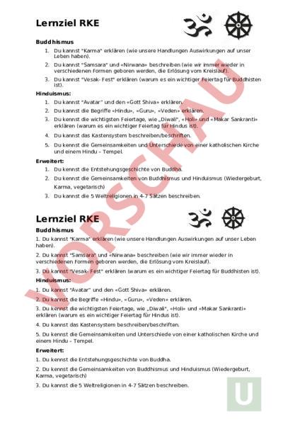 Lernziel RKE Buddhismus 1. Du kannst Karma erklären (wie unsere Handlungen Auswirkungen auf unser Leben haben). 2. Du kannst Samsara und «Nirwana» beschreiben (wie wir immer wieder in verschiedenen Formen geboren werden, die Erlösung vom Kreislauf). 3. Du kannst Vesak- Fest erklären (warum es ein wichtiger Feiertag für Buddhisten ist). Hinduismus: 1. Du kannst Avatar und den «Gott Shiva» erklären. 2. Du kannst die Begriffe «Hindu», «Guru», «Veden» erklären. 3. Du kennst die wichtigsten Feiertage, wie „Diwali, «Holi» und «Makar Sankranti» erklären (warum es ein wichtiger Feiertag für Hindus ist). 4. Du kannst das Kastensystem beschreiben/beschriften. 5. Du kennst die Gemeinsamkeiten und Unterschiede von einer katholischen Kirche und einem Hindu – Tempel. Erweitert: 1. Du kennst die Entstehungsgeschichte von Buddha. 2. Du kennst die Gemeinsamkeiten von Buddhismus und Hinduismus (Wiedergeburt, Karma, vegetarisch) 3. Du kannst die 5 Weltreligionen in 4-7 Sätzen beschreiben. Lernziel RKE Buddhismus 1. Du kannst Karma erklären (wie unsere Handlungen Auswirkungen auf unser Leben haben). 2. Du kannst Samsara und «Nirwana» beschreiben (wie wir immer wieder in verschiedenen Formen geboren werden, die Erlösung vom Kreislauf). 3. Du kannst Vesak- Fest erklären (warum es ein wichtiger Feiertag für Buddhisten ist). Hinduismus: 1. Du kannst Avatar und den «Gott Shiva» erklären. 2. Du kannst die Begriffe «Hindu», «Guru», «Veden» erklären. 3. Du kennst die wichtigsten Feiertage, wie „Diwali, «Holi» und «Makar Sankranti» erklären (warum es ein wichtiger Feiertag für Hindus ist). 4. Du kannst das Kastensystem beschreiben/beschriften. 5. Du kennst die Gemeinsamkeiten und Unterschiede von einer katholischen Kirche und einem Hindu – Tempel. Erweitert: 1. Du kennst die Entstehungsgeschichte von Buddha. 2. Du kennst die Gemeinsamkeiten von Buddhismus und Hinduismus (Wiedergeburt, Karma, vegetarisch) 3. Du kannst die 5 Weltreligionen in 4-7 Sätzen beschreiben.