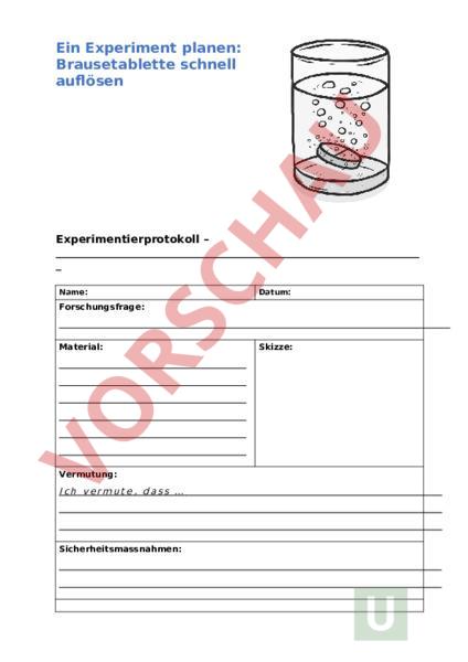 Ein Experiment planen: Brausetablette schnell auflösen Experimentierprotokoll – Name: Datum: Forschungsfrage: Material: Vermutung: Ich vermute, dass Sicherheitsmassnahmen: Skizze: Experimentieranleitung: Beobachtungen: Ich sehe höre rieche spüre messe Erklärung: Entsorgung: