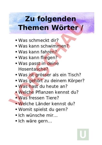 Zu folgenden Themen Wörter Sätze schreiben: Was schmeckt dir? Was kann schwimmen? Was kann fahren? Was kann fliegen? Was passt in deine Hosentasche? Was ist grösser als ein Tisch? Was gehört zu deinem Körper? Was hast du heute an? Welche Pflanzen kennst du? Was fressen Tiere? Welche Länder kennst du? Womit spielst du gern? Ich wünsche mir Ich wäre gern