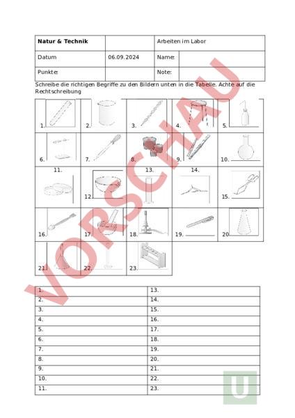 Natur Technik Datum Arbeiten im Labor 06.09.2024 Name: Punkte: Note: Schreibe die richtigen Begriffe zu den Bildern unten in die Tabelle. Achte auf die Rechtschreibung 1. 2. 3. 4. 5. 6. 7. 8. 9. 10. 11. 13. 14. 12. 15. 16. 17. 18. 21. 22. 23. 19. 1. 13. 2. 14. 3. 15. 4. 16. 5. 17. 6. 18. 7. 19. 8. 20. 9. 21. 10. 22. 11. 23. 20 12.